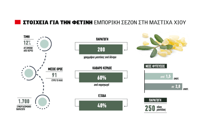 «Έχουµε ένα υψηλό µεικτό συντελεστή καθαρού κέρδους ανά παραγωγό περί το 60%, που σηµαίνει ότι τα έξοδα είναι στο 40%. Κι αυτός ήταν ένας από τους λόγους που παλιότερα ζητούσαµε τεκµαρτό προσδιορισµό, διότι ήταν ασύµφορο τότε να καλλιεργήσεις µε αυτή τη φορολογία», είπε και έσπευσε να διευκρινίσει πως η µαστίχας είναι µια δραστηριότητα εντάσεως εργασίας, µε µεροκάµατα για εργάτες και ενοίκια.