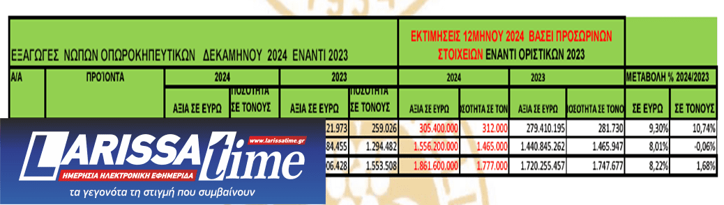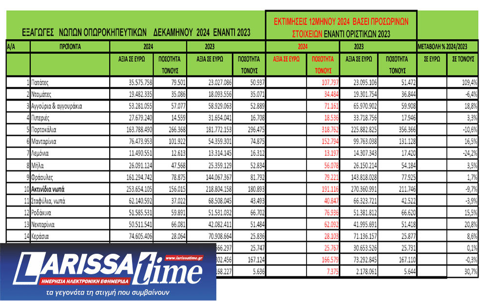 Έτος κατά το οποίο και οι εισαγωγές εκτιμάται ότι αυξήθηκαν κατακόρυφα, 13,6% βάσει επισήμων στοιχείων ενδεκαμήνου 2024 και προσωρινών στοιχείων για τον Δεκέμβριο. Ωστόσο, οι προκλήσεις παραμένουν έντονες, καθώς η έλλειψη υδάτινων πόρων και το αυξημένο κόστος παραγωγής απειλούν την ανταγωνιστικότητα των ελληνικών προϊόντων έναντι φθηνότερων εισαγομένων από τρίτες χώρες.