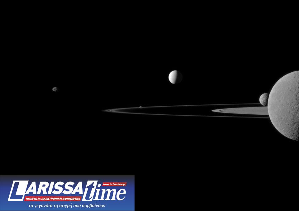 Φωτογραφία από την αποστολή Cassini με μερικά από τα φεγγάρια του Κρόνου. Το πιο φωτεινό, στο κέντρο της φωτογραφίας, είναι ο Εγκέλαδος