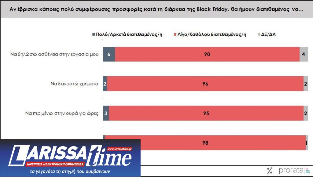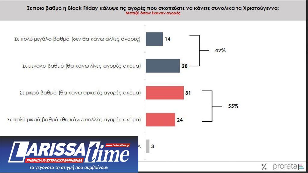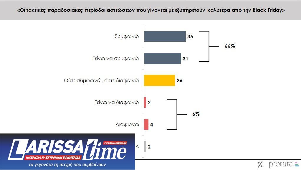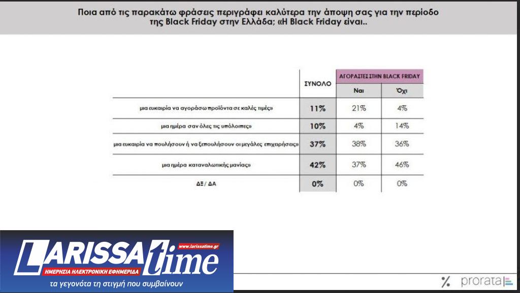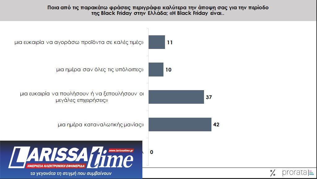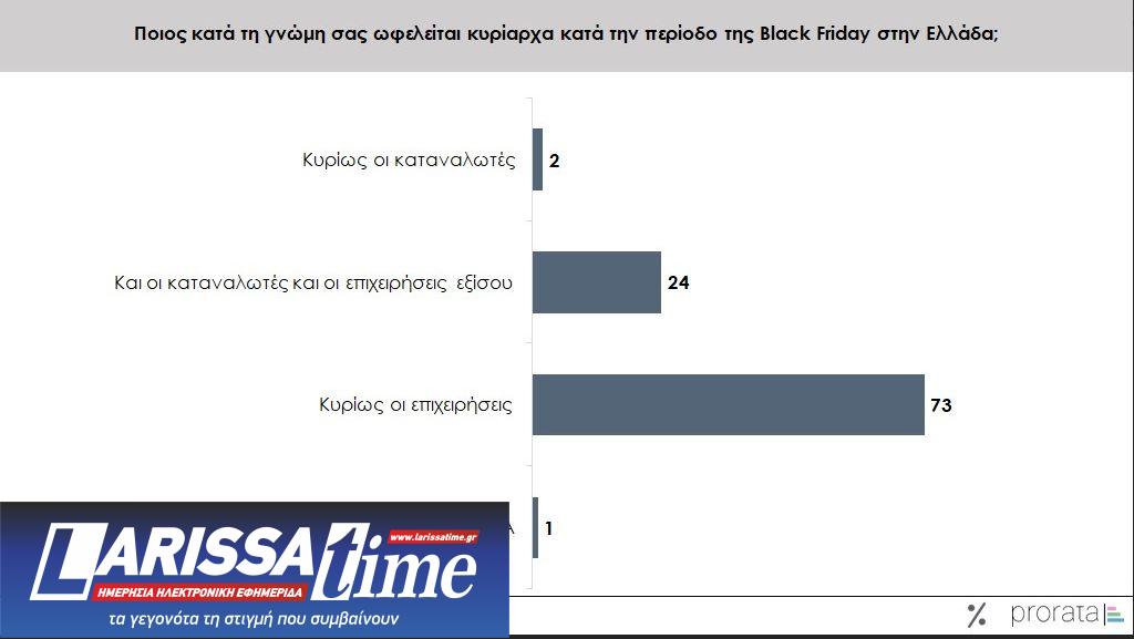 Αυτό προκύπτει από έρευνα της Prorata, με στόχο να καταγράψει τον βαθμό διείσδυσης της Black Friday στην ελληνική κοινωνία. Στην έρευνα αποτυπώνονται οι αντιλήψεις των Ελλήνων, καταγράφοντας τη συμμετοχή τους και ρίχνοντας βάρος σε πτυχές του καταναλωτικού θεσμού.