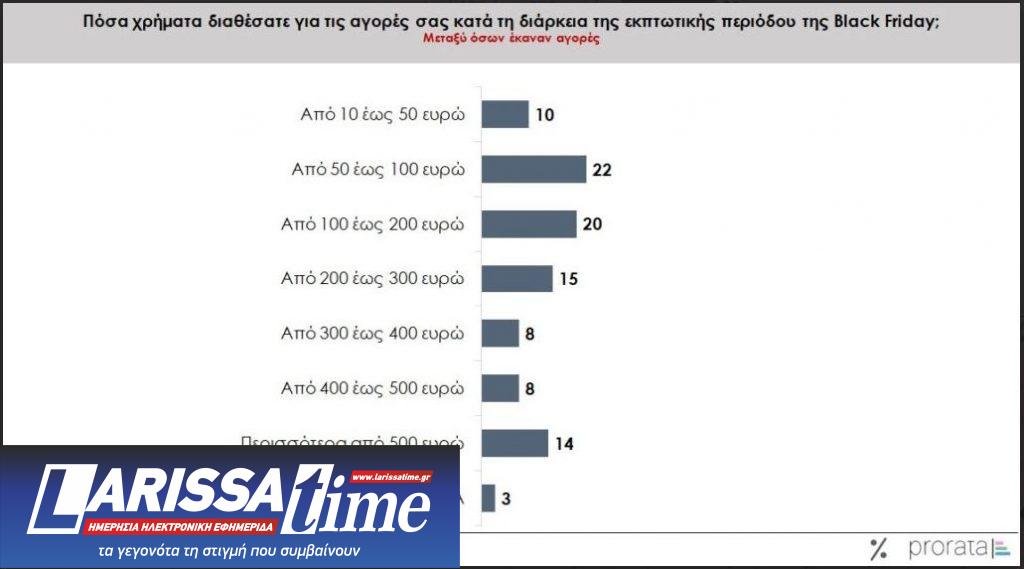 Οι μισοί από όσους απάντησαν ότι ψώνισαν δαπάνησαν κάτω από 100 ευρώ στη Black Friday. Ωστόσο, ένα σημαντικό ποσοστό 14% απάντησε ότι δαπάνησε πάνω από 500 ευρώ ενώ το 8% έδωσε μεταξύ 400 και 500 ευρώ στις αγορές του.