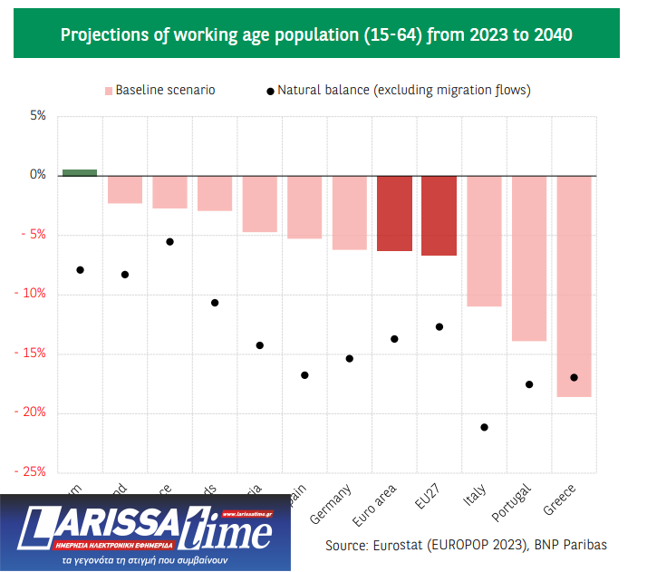 Μια θλιβερή πρωτιά της Ελλάδας στην Ευρωπαϊκή Ένωση αναδεικνύει η BNP Paribas, αυτή της ταχείας μείωσης του πληθυσμού σε ηλικία εργασίας, η οποία θα δυσκολέψει σημαντικά την προσπάθεια πράσινης μετάβασης, όπως άλλωστε θα συμβεί και σε αρκετές χώρες.
