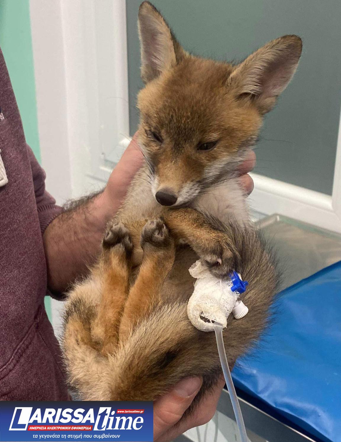 Το αλεπουδάκι είναι περίπου δύο μηνών και φέρει τραύματα στη δεξιά μεριά του κεφαλιού του.