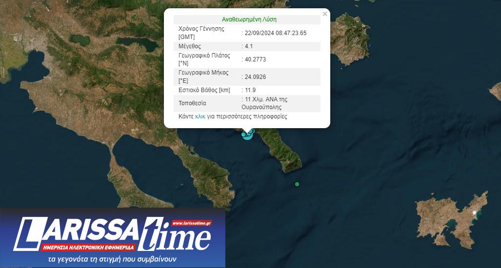 Σεισμός 4,1 βαθμών της κλίμακας Ρίχτερ σημειώθηκε στη Χαλκιδική το πρωί της Κυριακής.