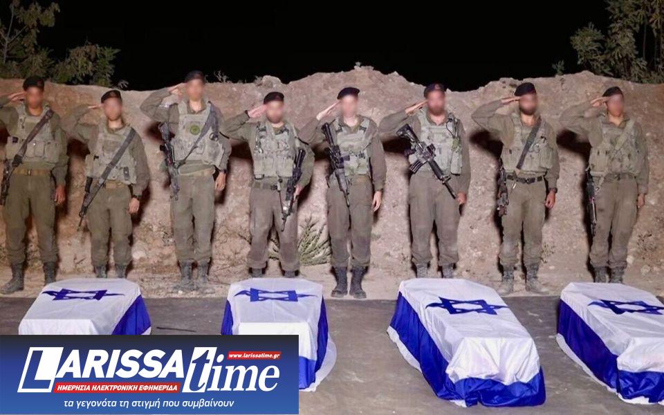 Στρατιώτες του Ισραηλινού Στρατού χαιρετούν πάνω από τα φέρετρα που περιέχουν τις σορούς των δολοφονημένων ομήρων στη Λωρίδα της Γάζας