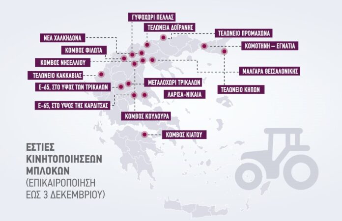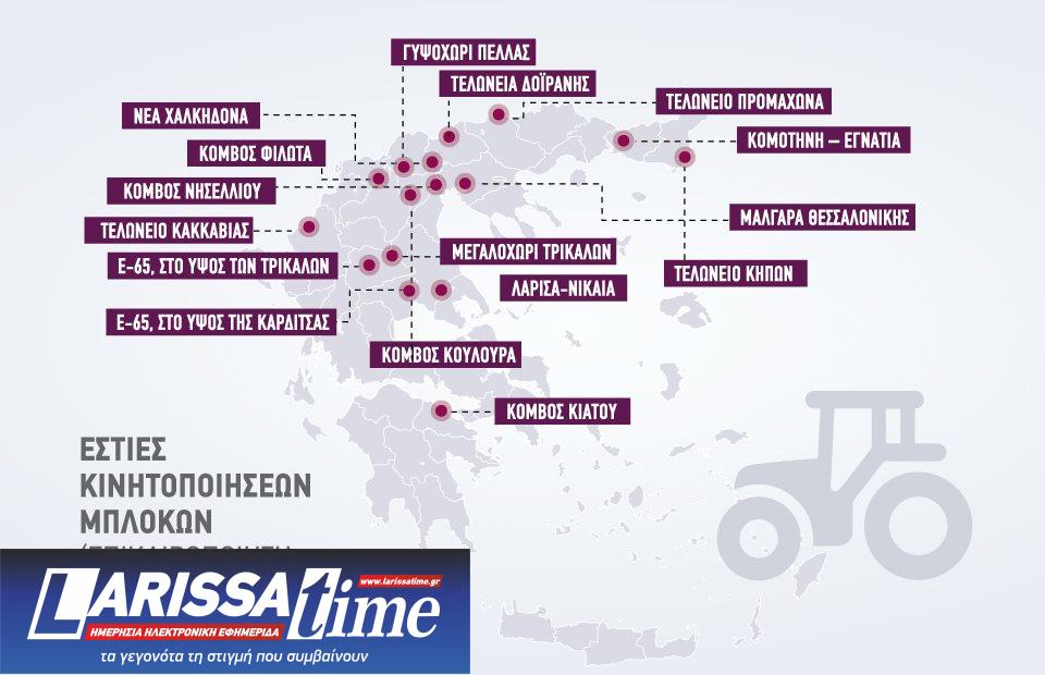 Τα µπλόκα δεν περιορίζονται στη Θεσσαλία. ∆υναµικές µορφές κινητοποίησης πραγµατοποιούνται σε Ανατολική Μακεδονία & Θράκη και όλη την υπόλοιπη Μακεδονία, οι οποίες προσαρµόζονται ανάλογα τις δυνατότητες και την αστυνοµική παρουσία. Από βδοµάδα αναµένεται να ακουστεί περισσότερο η Στερεά, η Πελοπόννησος αλλά και η Κρήτη.