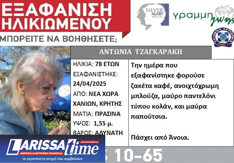 Μεγάλη είναι η αγωνία των συγγενών μίας 78χρονης γυναίκας στα Χανιά, που εξαφανίστηκε το μεσημέρι της Πέμπτης (24/04) και δεν έχει δώσει σημεία ζωής.