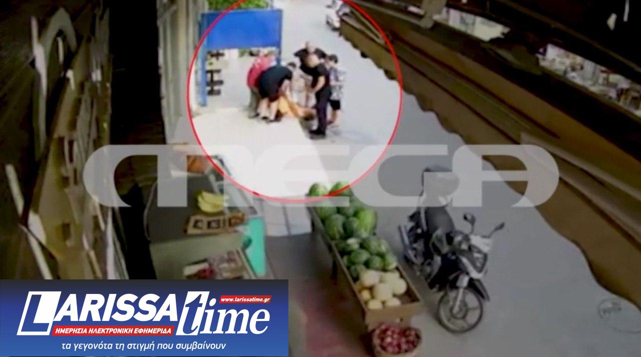 Ο άνδρας που βρίσκεται μαζί του τον συγκρατεί πριν πέσει, προσπαθεί να τον στηρίξει στο πεζοδρόμιο και να τον συνεφέρει.