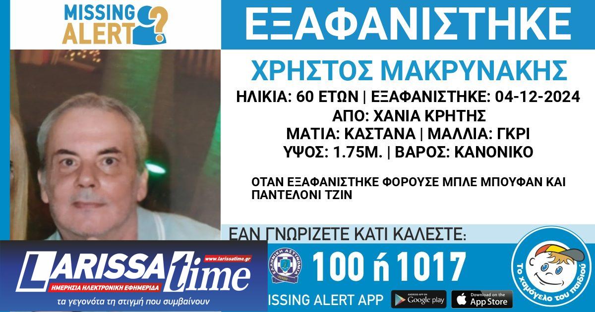 Έκκληση για συνδρομή στις έρευνες για τον εντοπισμό του 60χρονου Χρήστου Μακρυνάκη, απευθύνει η οικογένειά του, καθώς τα ίχνη του αγνοούνται από την Τετάρτη 4 Δεκεμβρίου.