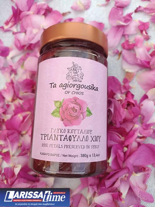 Το γλυκό τριαντάφυλλο, ένα από τα πιο διάσηµα γλυκά του κουταλιού της Χίου, έχει τις ρίζες του στην παραδοσιακή συνταγή από τη Σµύρνη. Πρόκειται για ένα σπιτικό γλυκό που προέρχεται από τα φυσικά πέταλα του τριαντάφυλλου, διατηρώντας την αυθεντικότητα και την ποιότητα της βελούδινης και συνάµα κρουστής υφής του, χωρίς την προσθήκη χηµικών συντηρητικών και χρωστικών ουσιών. Το γλυκό τριαντάφυλλο φτιάχνεται από ειδικές ποικιλίες ρόδων, το µαγιάτικο, το εκατόφυλλο και το πολίτικο, όπως κα το ροδόνερο, ένα 100% φυσικό και βιολογικό προϊόν, µε υπέροχο άρωµα και πλούσιες ευεργετικές ιδιότητες. Παράγεται µε παραδοσιακή απόσταξη, διατηρώντας όλη τη φυσική του αξία, ενώ τα υπολείµµατα χρησιµοποιούνται ως φυσικό λίπασµα σε χωράφια.