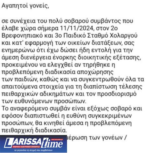 Σύμφωνα με ανακοίνωση του Δήμου Παπάγου – Χολαργού θα ελεγχθεί αν τηρήθηκε η προβλεπόμενη διαδικασία αποχώρησης των παιδιών, ενώ θα συγκεντρωθούν όλα τα απαιτούμενα στοιχεία για τη διαπίστωση τέλεσης πειθαρχικών αδικημάτων μιας και το περιστατικό είναι «εξόχως σοβαρό».