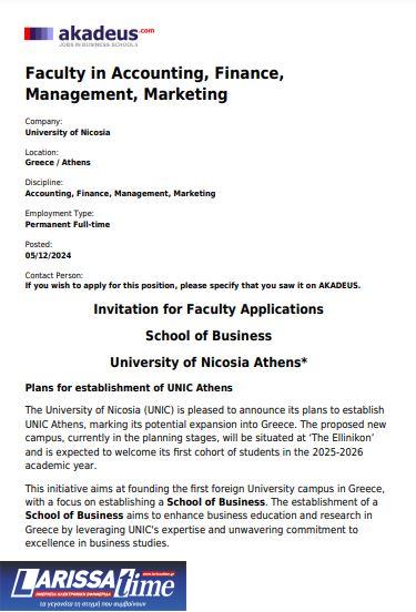 Με ανακοίνωση στην ιστοσελίδα akadeus.net, στην οποία δημοσιεύονται θέσεις εργασίας σε σχολές διοίκησης επιχειρήσεων ανά τον κόσμο, το University of Nicosia, ένα ιδιωτικό κυπριακό πανεπιστήμιο ιδιοκτησίας που ανήκει στο fund CVC, ζητά καθηγητές για τη Σχολή Διοίκησης Επιχειρήσεων (Business School) που θα λειτουργήσει το 2025-2026 στην Αθήνα.