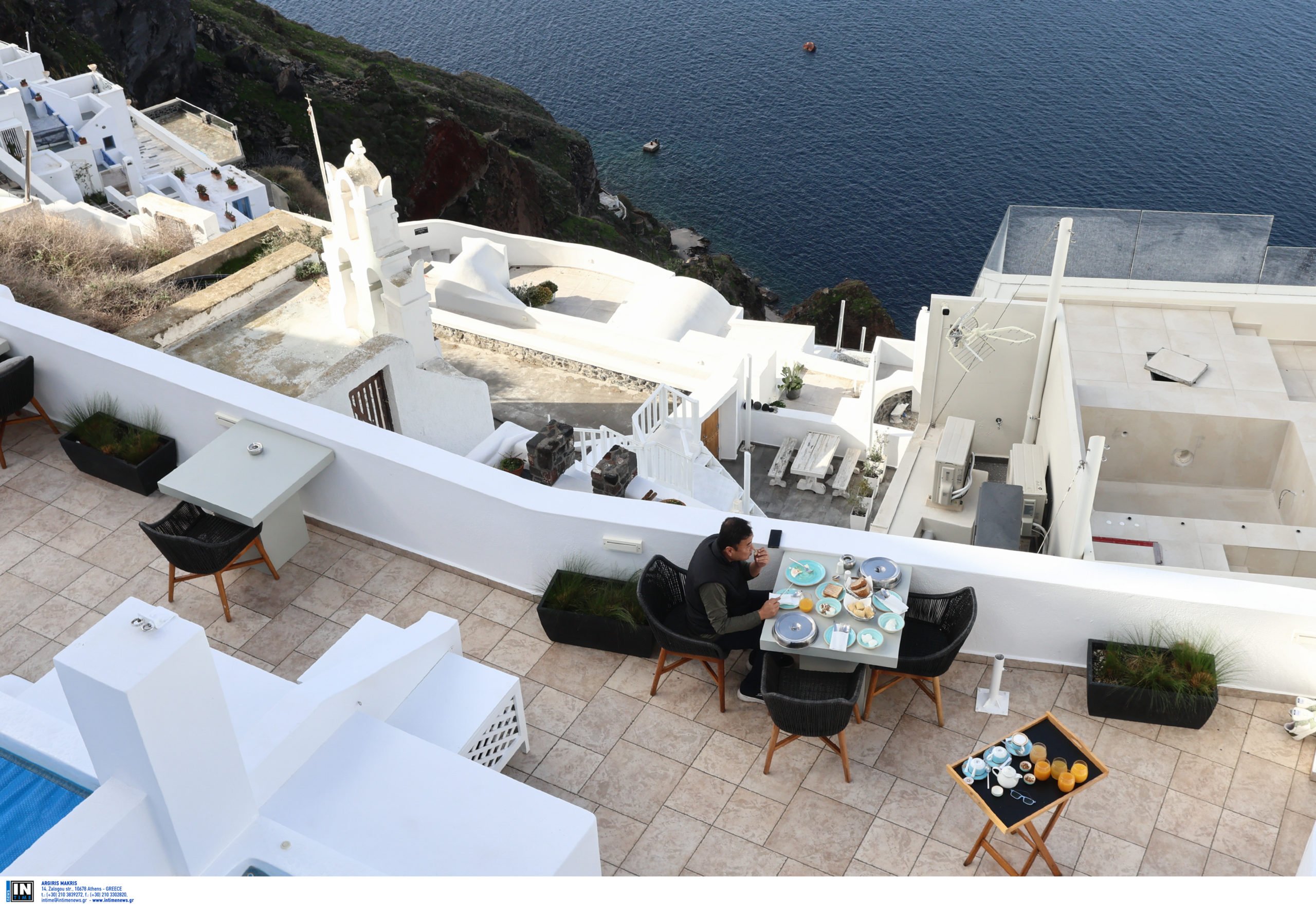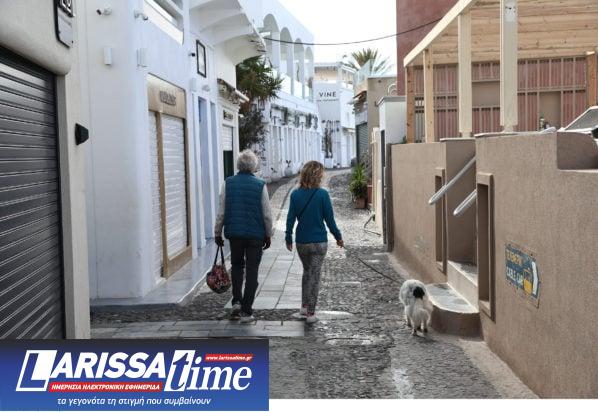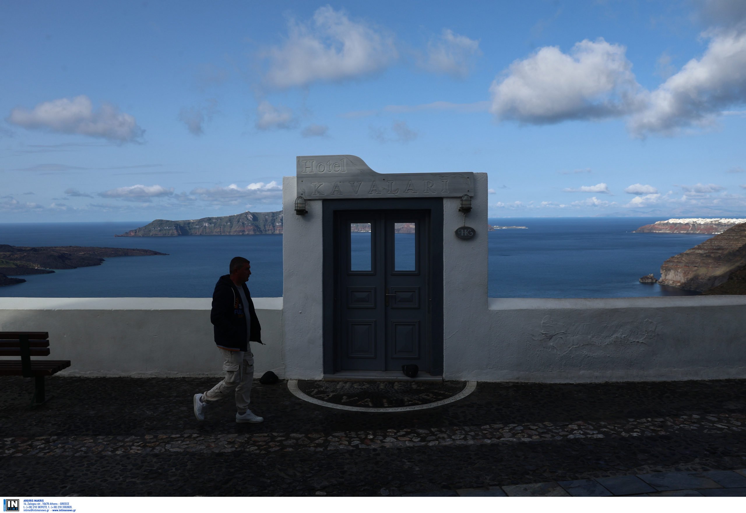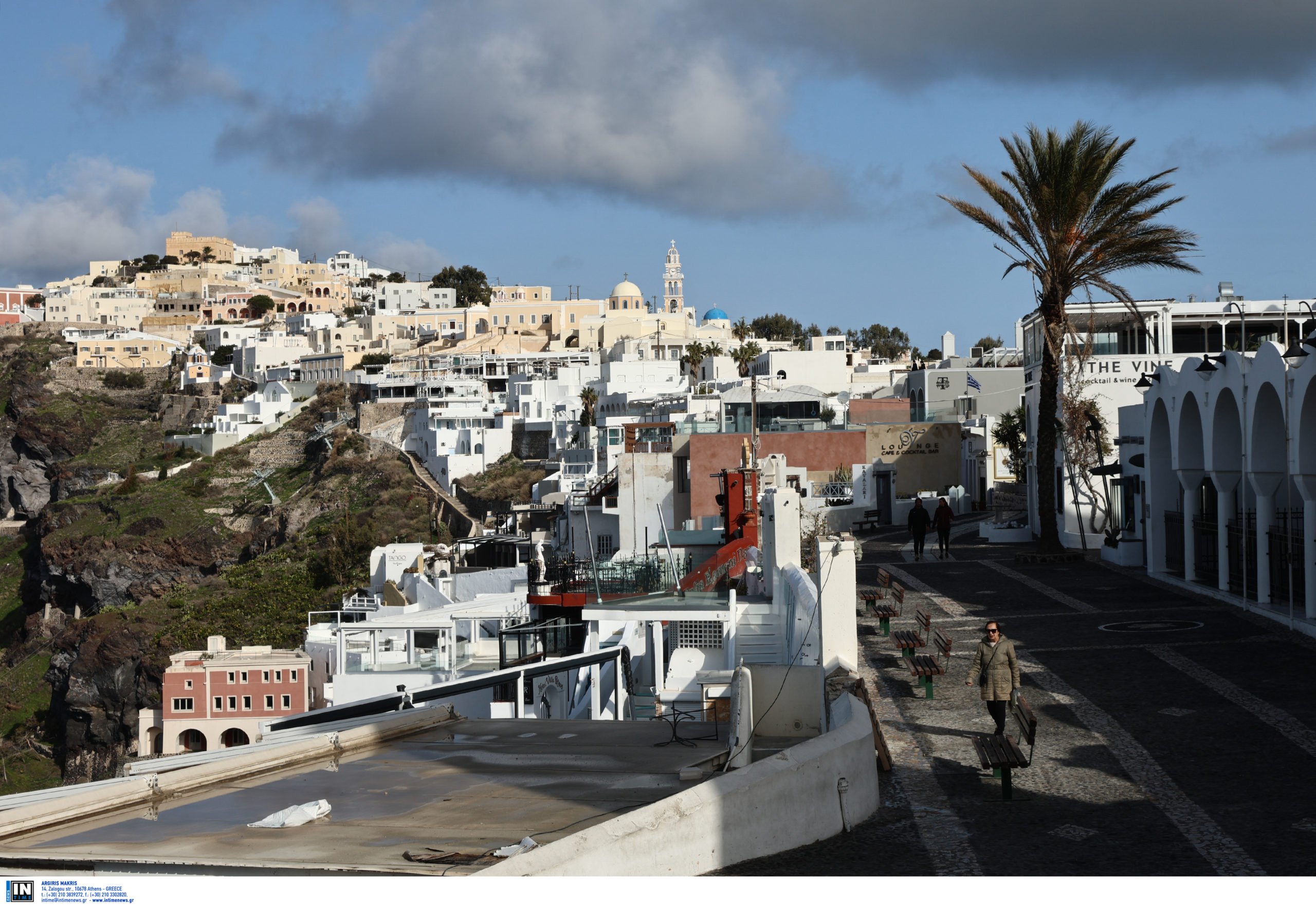Λιγοστοί είναι οι κάτοικοι και οι επισκέπτες που έκαναν την βόλτα τους στα φημισμένα σοκάκια νωρίτερα το πρωί της Τρίτης (4/2). Ελάχιστοι και οι τουρίστες που απολαμβάνουν τις υπηρεσίες των πολυτελών καταλυμάτων στην καλντέρα.