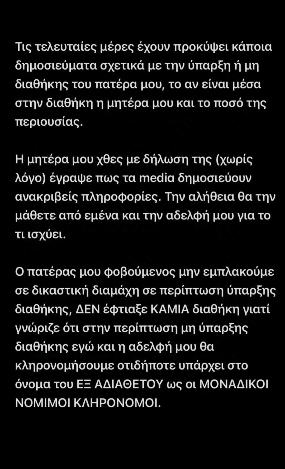 «Τις τελευταίες μέρες έχουν προκύψει κάποια δημοσιεύματα σχετικά με την ύπαρξη ή μη διαθήκης του πατέρα μου, το αν είναι μέσα στη διαθήκη η μητέρα μου και το ποσό της περιουσίας. Η μητέρα μου χθες με δήλωσή της (χωρίς λόγο) έγραψε πως τα media δημοσιεύουν ανακριβείς πληροφορίες. Την αλήθεια θα την μάθετε από εμένα και την αδελφή μου για το τι ισχύει.