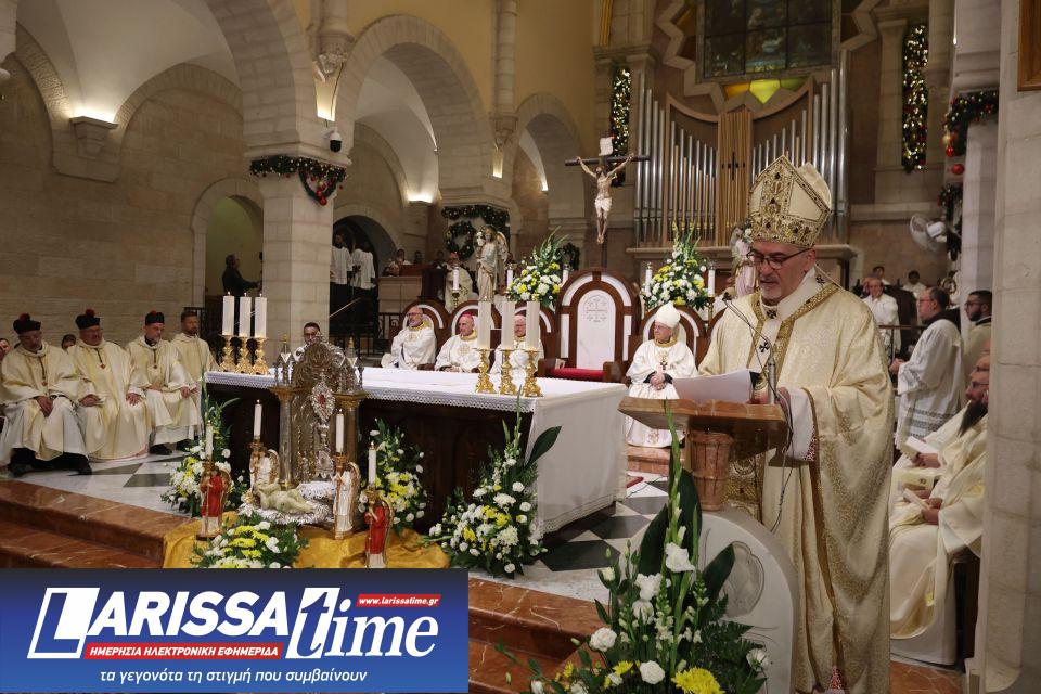 Ο Λατίνος Πατριάρχης Πιερμπατίστα Πιτσαμπάλα τελεί τη χριστουγεννιάτικη μεταμεσονύκτια λειτουργία στην εκκλησία της Γεννήσεως του Ιησού, στην Βηθλεέμ της Δυτικής Όχθης
