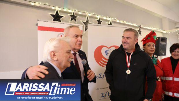 Ο πρόεδρος του ΣΦΕΕ Ολ. Παπαδημητρίου και ο πρόεδρος του Ε.Ε.Σ. δρ Αντ. Αυγερινός, μοιράζουν δώρα στα παιδιά που φιλοξενούνται στο Παράρτημα Αποθεραπείας και Αποκατάστασης Παιδιών με Αναπηρίες στη Βούλα