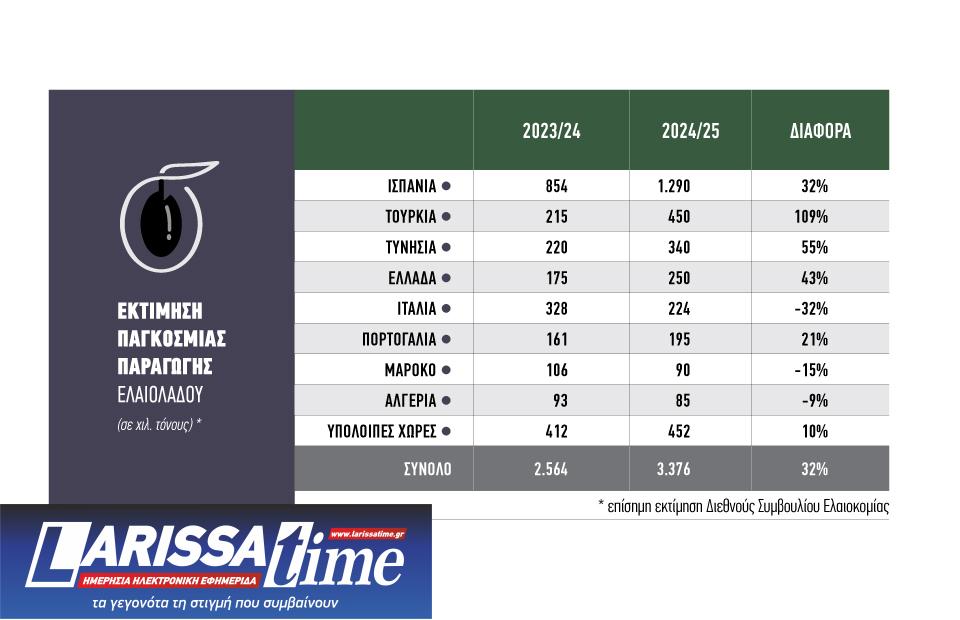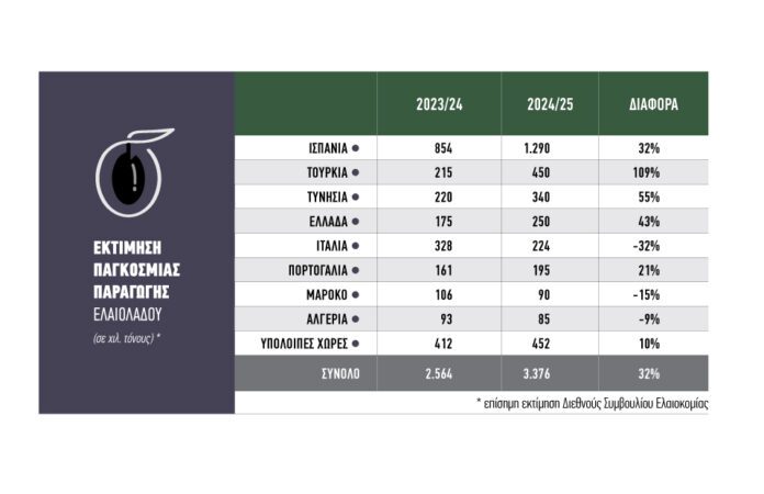 Από την Ισπανία το…περιµέναν οι κλαδικοί αναλυτές, όµως από Τουρκία και Τυνησία φαίνεται πως έρχεται (στα χαρτιά τουλάχιστον) το σοκ προσφοράς στην αγορά ελαιολάδου, µε την παγκόσµια παραγωγή να εκτιµάται στους 3,4 εκατ. τόνους, µε την συµµετοχή των εξωκοινοτικών αγορών να διασπά ανοδικά τους 1,2 εκατ. τόνους για πρώτη φορά µετά την περίοδο 2021/22, έναντι 700-900 χιλιάδων που συνηθιζόταν. Τα νούµερα από µόνα τους λένε λίγα πράγµατα, όµως για πρώτη φορά έχουµε την εκτίµηση πως η παγκόσµια κατανάλωση θα παίξει πάνω από 3 εκατ. τόνους την φετινή σεζόν.