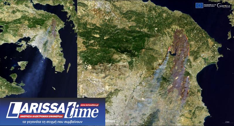 Η ευρωπαϊκή υπηρεσία Copernicus δημοσιεύει μια πρώτη εικόνα από τα καμένα στρέμματα.