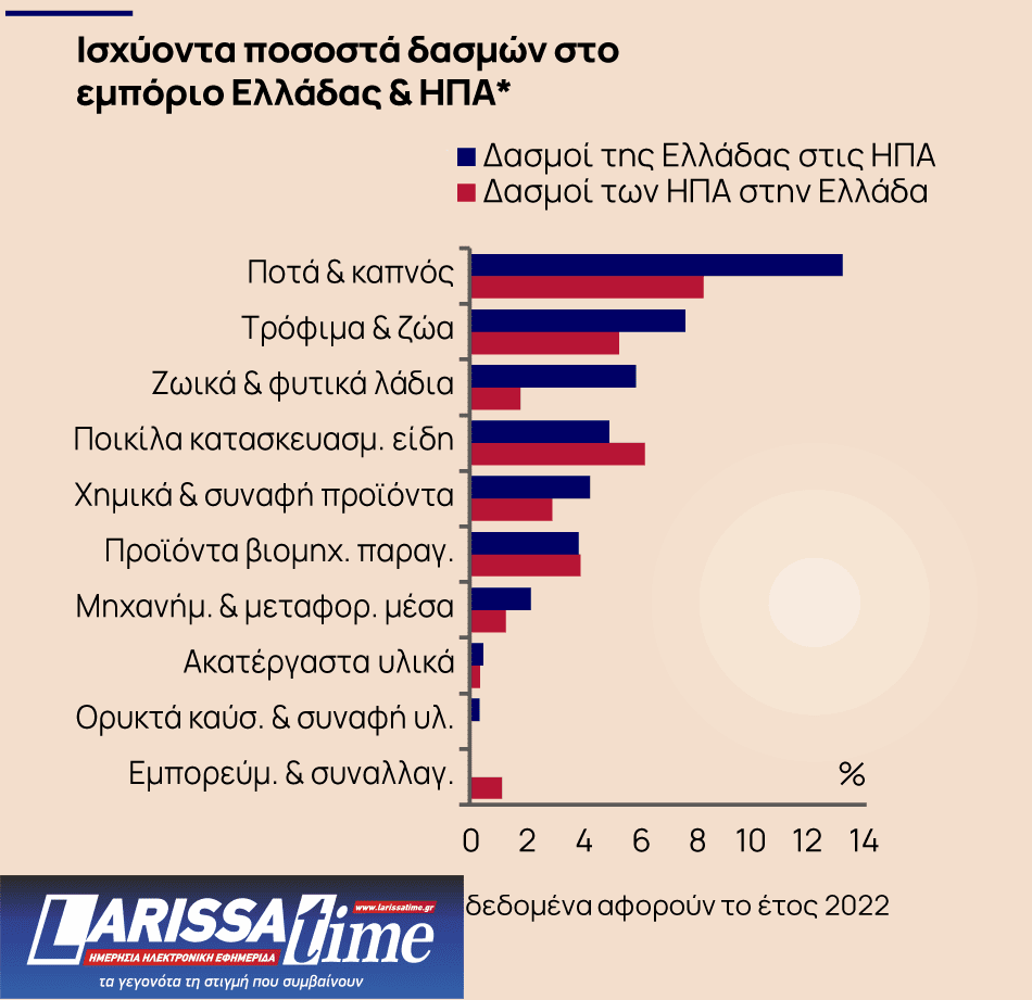 Η ΕΤΕ αναφέρει ότι όσον αφορά τις εμπορικές συναλλαγές της Ελλάδας με τις ΗΠΑ, η περιορισμένη έκθεση στην εν λόγω αγορά και η διάρθρωση των ελληνικών εξαγωγών φαίνεται να περιορίζουν τις άμεσες επιπτώσεις. Συγκεκριμένα, η ελληνική οικονομία διατήρησε ένα πλεονασματικό εμπορικό ισοζύγιο κατά την προηγούμενη δεκαετία, με το πλεόνασμα να κυμαίνεται στα 0,5 δισ. ευρώ, κατά μ.ό., ετησίως την περίοδο 2015-2018 και να υποχωρεί τα επόμενα χρόνια.