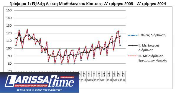 Ο Δείκτης Μισθολογικού Κόστους του Α΄ τριμήνου 2024, με διόρθωση ως προς τον αριθμό των εργασίμων ημερών αλλά χωρίς εποχική διόρθωση, σε σύγκριση με τον αντίστοιχο Δείκτη του Α΄ τριμήνου 2023, παρουσιάζει αύξηση κατά 7,9% έναντι αύξησης 6,4% κατά την αντίστοιχη σύγκριση του έτους 2023 προς το 2022.