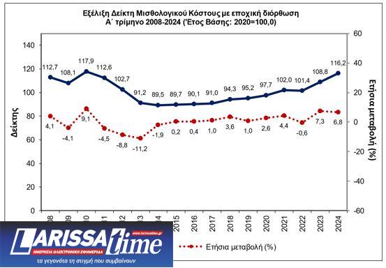 Ο Δείκτης Μισθολογικού Κόστους του Α΄ τριμήνου 2024, με εποχική διόρθωση αλλά χωρίς διόρθωση ως προς τον αριθμό των εργασίμων ημερών, σε σύγκριση με τον αντίστοιχο Δείκτη του Α΄ τριμήνου 2023, παρουσιάζει αύξηση κατά 6,8% έναντι αύξησης 7,3% κατά την αντίστοιχη σύγκριση του έτους 2023 προς το 2022.