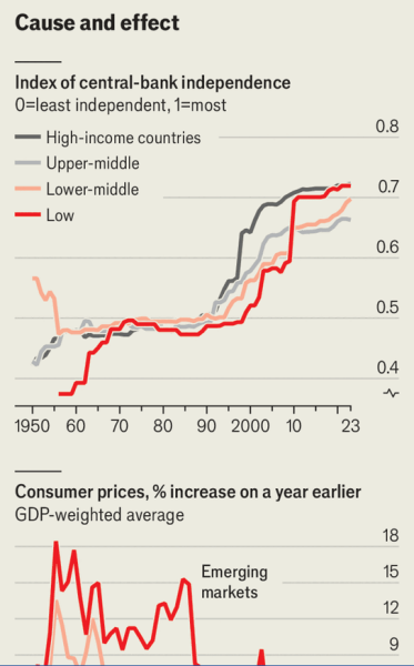 Το…κίνημα κέρδισε έδαφος στη δεκαετία του 1980, καθώς η θεωρητική και εμπειρική έρευνα στήριξε την ανεξαρτησία. Οι πολιτικοί, σύμφωνα με το επιχείρημα, μπαίνουν στον πειρασμό να εφαρμόσουν αυτοκαταστροφικές νομισματικές πολιτικές με στόχο την υψηλή απασχόληση, την αύξηση των χρεών και τις εκλογικές νίκες. Στόχοι όπως η πλήρης απασχόληση και το χαμηλό κόστος δανεισμού, που βελτιώνουν τη ζωή όλων, είναι ευκολότερο να επιτευχθούν αν η πολιτική ανατεθεί σε έναν συντηρητικό κεντρικό τραπεζίτη, ίσως ακόμη και σε έναν εμμονικό με τον πληθωρισμό.
