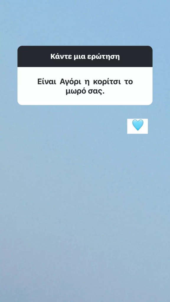 Πιο συγκεκριμένα, όταν διαδικτυακός της φίλος τη ρώτησε αν είναι κορίτσι ή αγόρι, η Ευρυδίκη Παπαδοπούλου απάντησε με μία γαλάζια καρδούλα που μαρτυρά ότι περιμένει αγοράκι.
