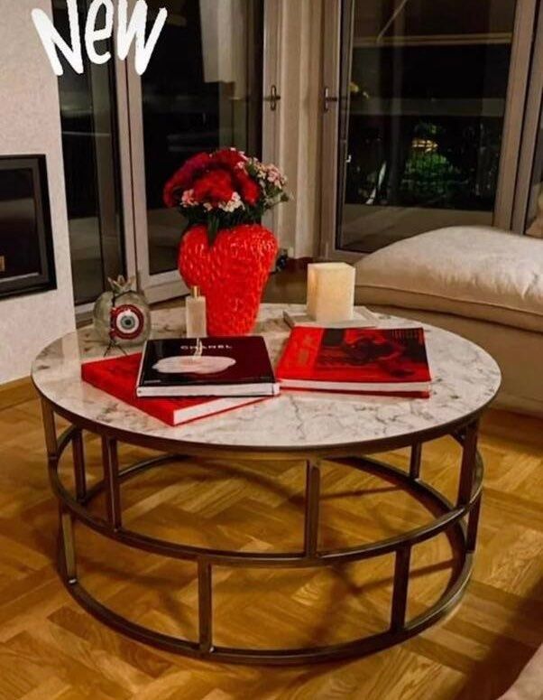 Το σαλόνι είναι ιδιαίτερα φωτεινό, ενώ κυριαρχούν το εκρού και το λευκό, με ένα μαρμάρινο τραπεζάκι, εκρού καναπέ, και φυσικά τζάκι. Τέλος, η κρεβατοκάμαρά της παραπέμπει σε δωμάτιο lux ξενοδοχείου, με ένα επιβλητικό κρεβάτι, πολλά μαξιλάρια και ξύλινο πάτωμα με λευκό χαλί.