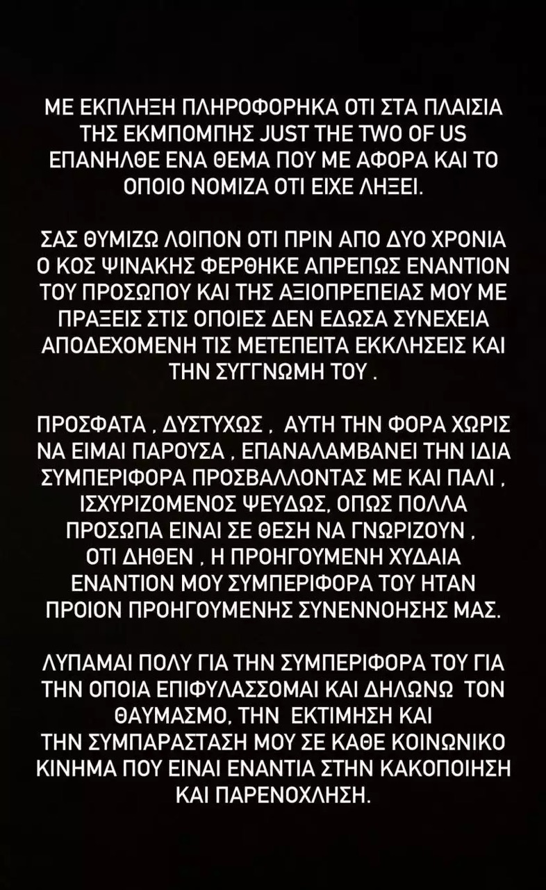 Μετά την αναταραχή που προκλήθηκε από τις πρόσφατες δηλώσεις του Ηλία Ψινάκη σχετικά με τη Μαίρη Συνατσάκη και το κίνημα metoo κατά τη διάρκεια ενός live του J2US, η Κατερίνα Λιόλιου αποφάσισε να τοποθετηθεί δημόσια, καθώς αφορά ένα ζήτημα που την επηρεάζει άμεσα.