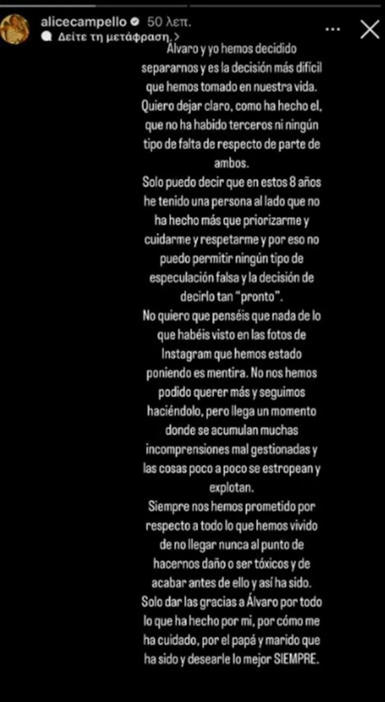 Δεν θέλω να νομίζετε ότι όσα έχετε δει στις φωτογραφίες μας που βάζαμε στα social media είναι ψέμα. Συνεχίζουμε να αγαπάμε ο ένας τον άλλον όμως έρχεται η στιγμή όπου πολλές παρεξηγήσεις συσσωρεύονται και τα πράγματα σιγά-σιγά καταρρέουν. Υποσχεθήκαμε ο ένας τον άλλον να μη φτάσουμε ποτέ στο σημείο να είμαστε τοξικοί και να τελειώσουμε κάτι όμορφο με άσχημο τρόπο. Θέλω απλά να ευχαριστήσω τον Άλβαρο για όσα έχει κάνει για μένα, για το πώς με φρόντισε, για τον πατέρα και το σύζυγο που υπήρξε και του εύχομαι τα καλύτερα πάντα”.