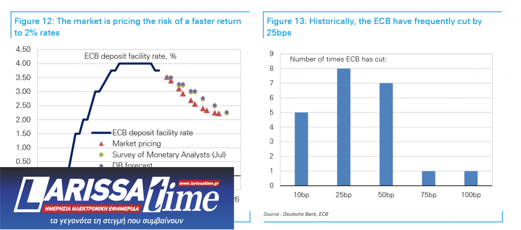 Στην ίδια ανάλυσή της, η Deutsche Bank υπενθυμίζει ότι στις 12 Σεπτεμβρίου αναμένεται η ΕΚΤ να μειώσει τα επιτόκια κατά 25 μ.β. στο 3,50%. Αυτό επιβεβαιώνει ότι τον Ιούνιο δεν ήταν μια εφάπαξ περικοπή του επιτοκίου και η ΕΚΤ βρίσκεται στη φάση περιορισμού της νομισματικής σύσφιξης.