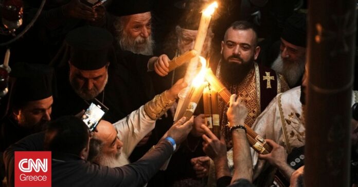 Ο Πατριάρχης εξήλθε από τον Πανάγιο Τάφο λίγω μετά τις 14.00 κρατώντας τις 33 λαμπάδες, όπως προστάζει το τελετουργικό μία για κάθε έτος του Χριστού στη Γη με το συγκεντρωμένο πλήθος να σπεύδει να λάβει το ανέσπερο φως με τις καμπάνες να κομίζουν το χαρμόσυνο μήνυμα της Ανάστασης του Κυρίου.