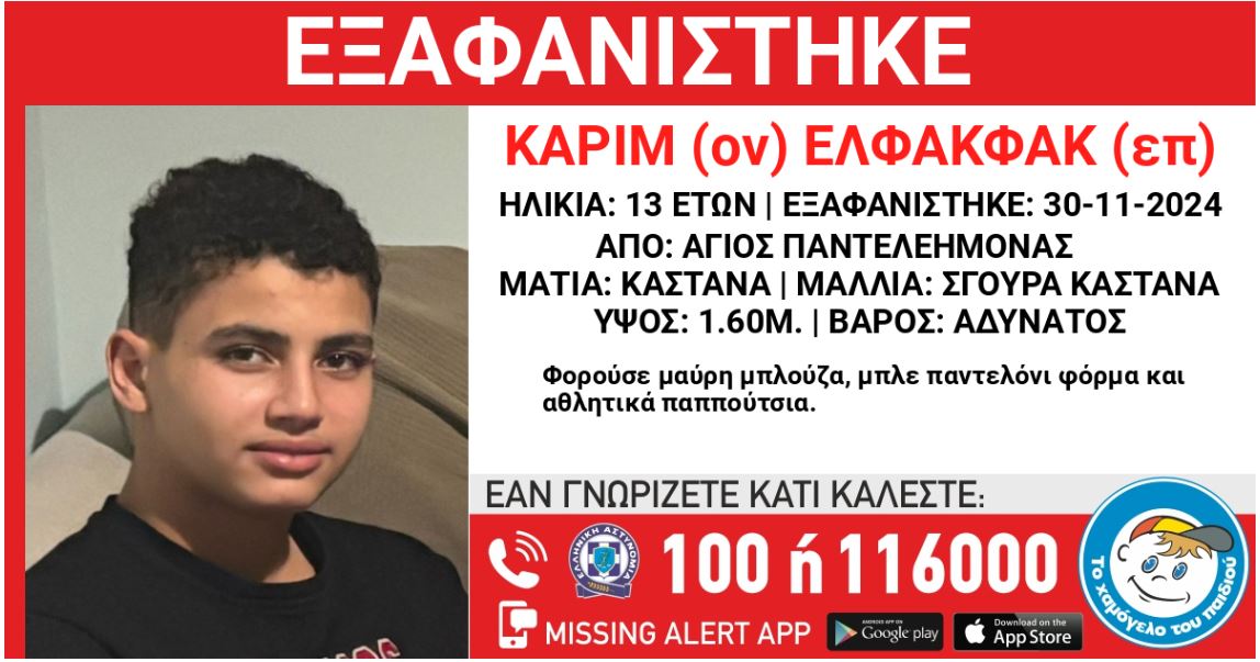 «Στις 30/11/2024 απογευματινές ώρες, εξαφανίστηκε από χώρο φιλοξενίας στη περιοχή του Αγίου Παντελεήμονα ο Καρίμ (ον.) Ελφακφάκ (επ.), 13 ετών, Αιγυπτιακής καταγωγής. «Το Χαμόγελο του Παιδιού» ενημερώθηκε για την εξαφάνιση του ανηλίκου σήμερα 02/12/24 και προχώρησε στην δημοσιοποίηση των στοιχείων του, καθώς συντρέχουν λόγοι που θέτουν την ζωή του σε κίνδυνο.
