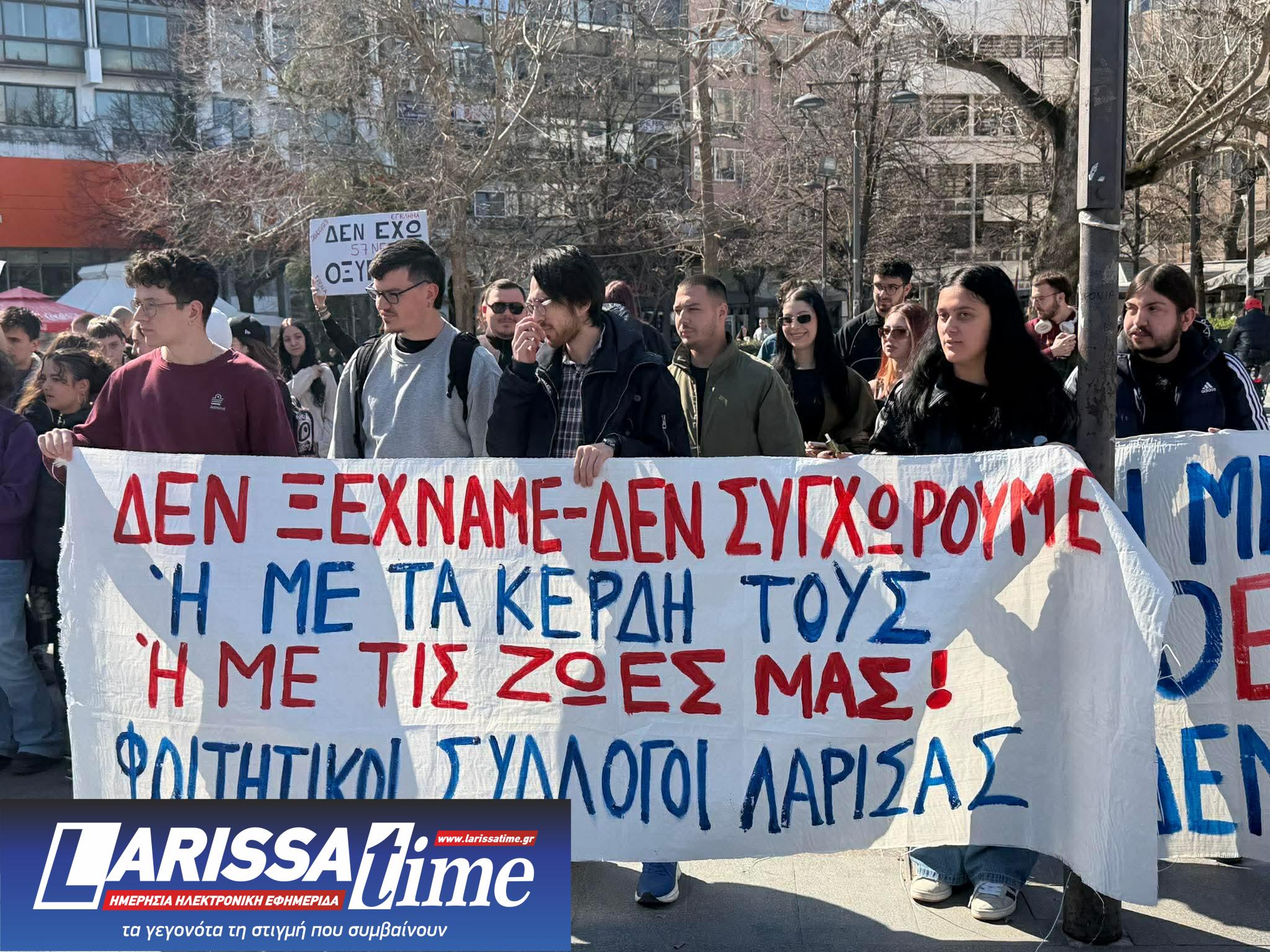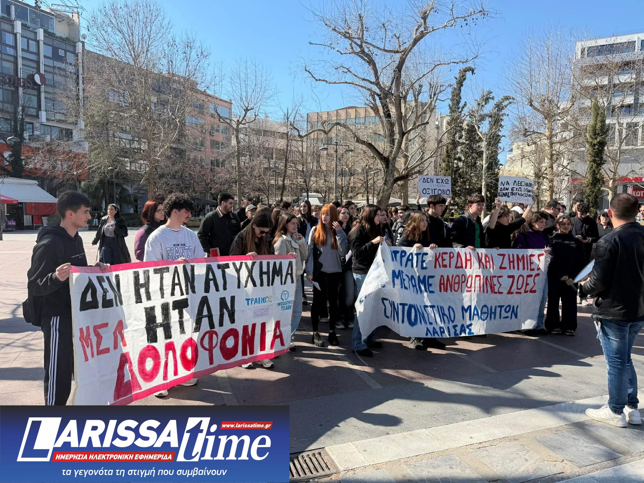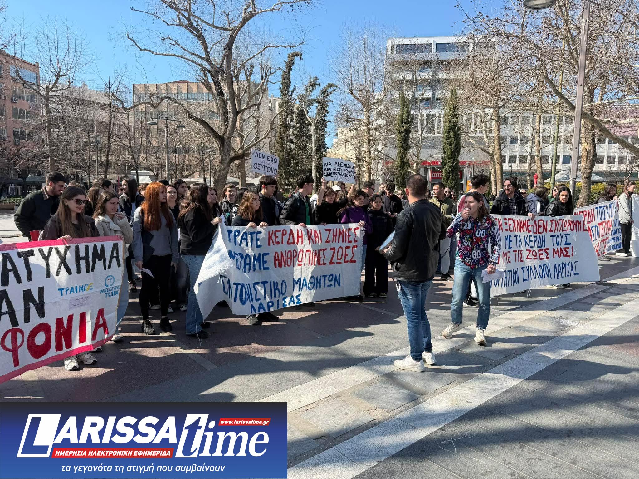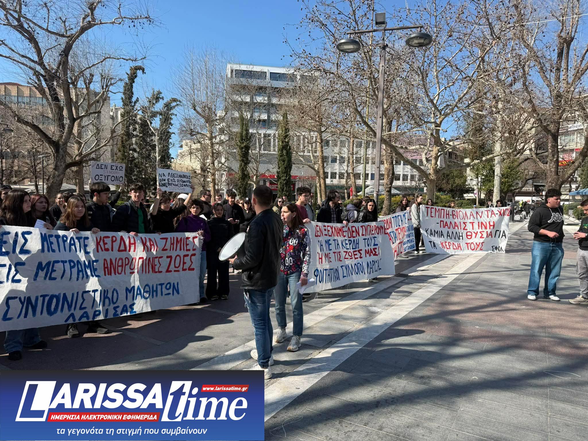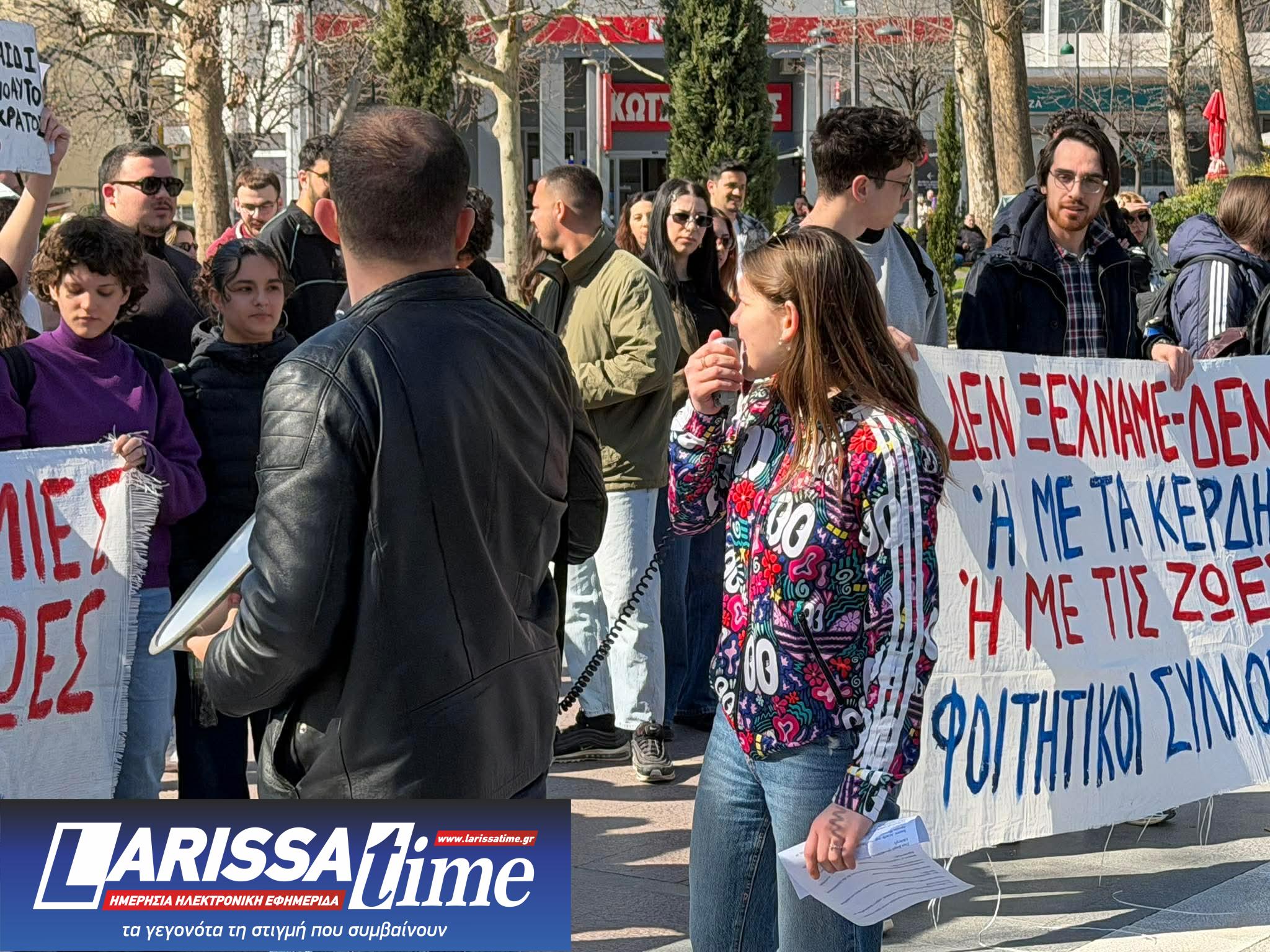 Συλλαλητήριο για τα τρία χρόνια από την τραγωδία στα Τέμπη που συμπληρώνονται το Σάββατο 28 Φεβρουαρίου, πραγματοποίησαν σήμερα το μεσημέρι μαθητικοί και φοιτητικοί σύλλογοι της Λάρισας στην Κεντρική Πλατεία Λάρισας.