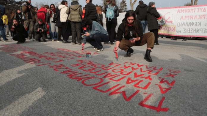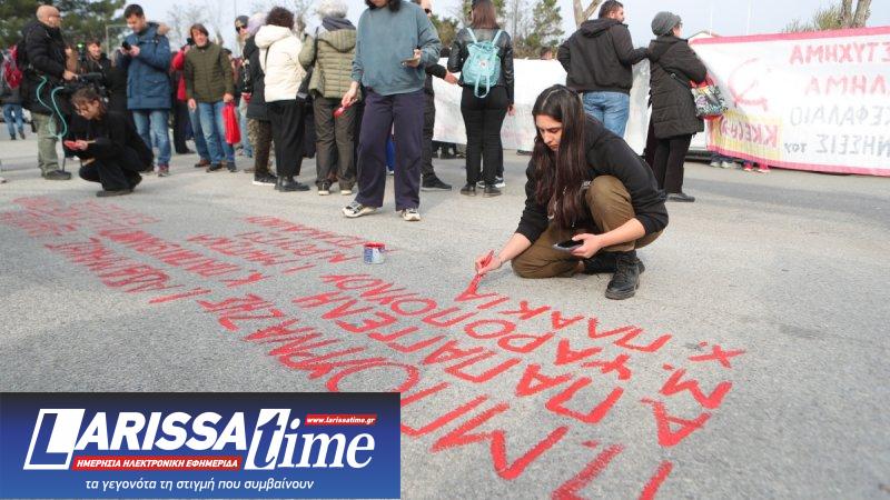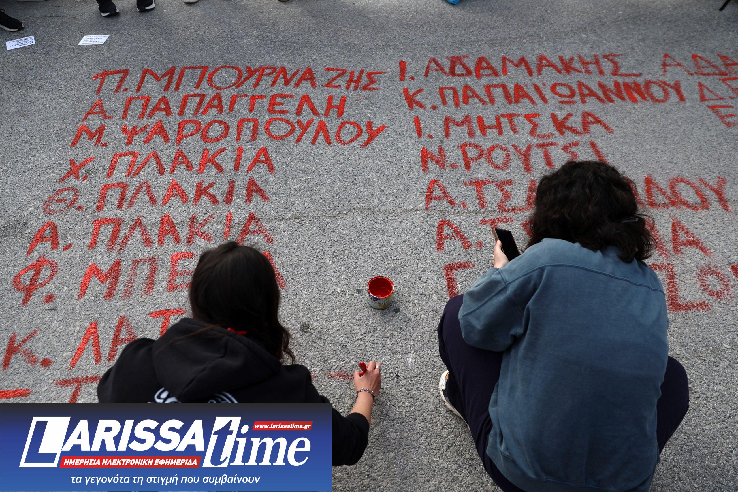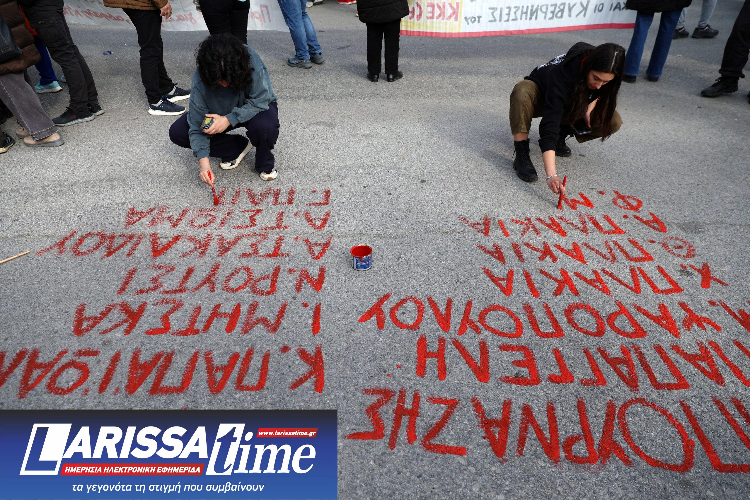 Ομάδα φοιτητών, που συμμετέχει στην κινητοποίηση απέναντι από το κτίριο όπου διεξάγεται η δίκη για το δυστύχημα στα Τέμπη, έγραψε με κόκκινη μπογιά τα ονόματα των θυμάτων στο έδαφος.