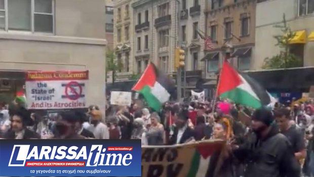 Οι διαδηλωτές κρατούσαν παλαιστινιακές σημαίες, χτυπούσαν τύμπανα και φώναζαν «ελεύθερη, ελεύθερη Παλαιστίνη!» και «Ράφα! Γάζα!». Αξίζει να σημειωθεί ότι τη Δευτέρα, το Ισραήλ διέταξε τους κατοίκους της Γάζας να εκκενώσουν τμήματα της ανατολικής Ράφα πριν εξαπολύσει μια καταστροφική επίθεση στην πόλη.