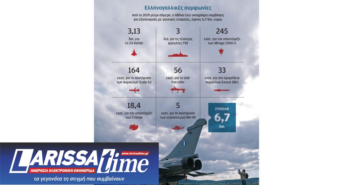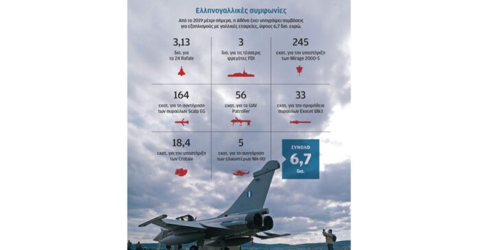 Σημειώνεται ότι, από το 2019 μέχρι σήμερα, η Αθήνα έχει υπογράψει συμβάσεις για εξοπλισμούς με γαλλικές εταιρείες ύψους 6,7 δισ. ευρώ, μέσω των οποίων θα μπορούσε να ασκήσει πιέσεις στο Παρίσι. Πιο συγκεκριμένα, 3,13 δισ. για τα 24 Rafale, 3 δισ. για τις τέσσερις φρεγάτες FDI, 245 εκατ. για την υποστήριξη των Mirage 2000-5 και 164 εκατ. για τη συντήρηση των πυραύλων Scalp EG, 56 εκατ. για τα UAV Patroller, 33 εκατ. για την προμήθεια πυραύλων Exocet Blk3, 18,4 εκατ. για την υποστήριξη των Crotale και 5 εκατ. για τη συντήρηση των ελικοπτέρων ΝΗ-90.