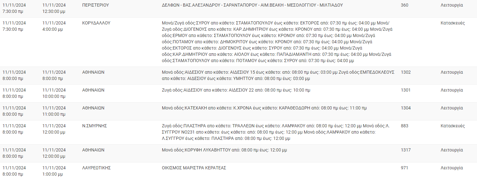 Διακοπές ρεύματος σήμερα (11/11) στην Αθήνα και σε άλλες 5 περιοχές της Αττικής