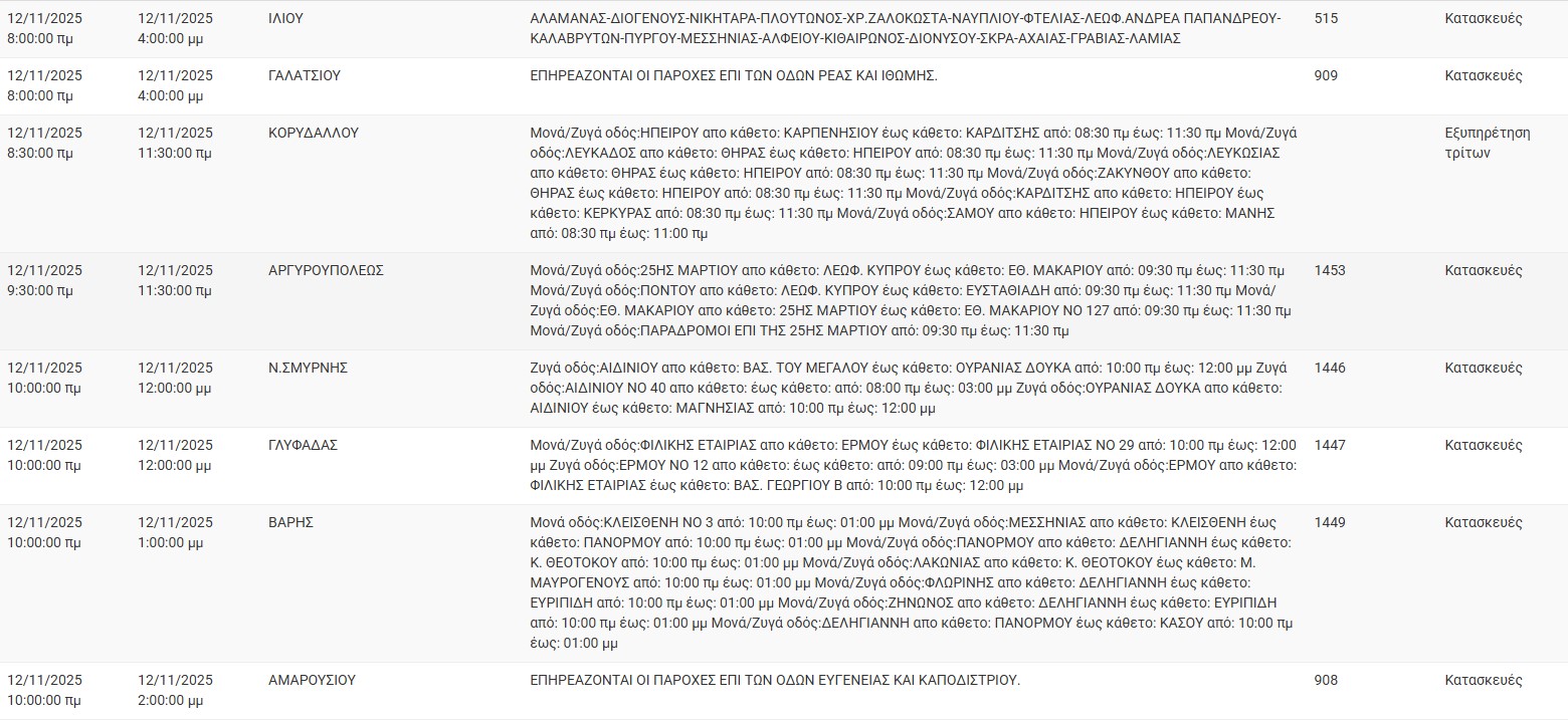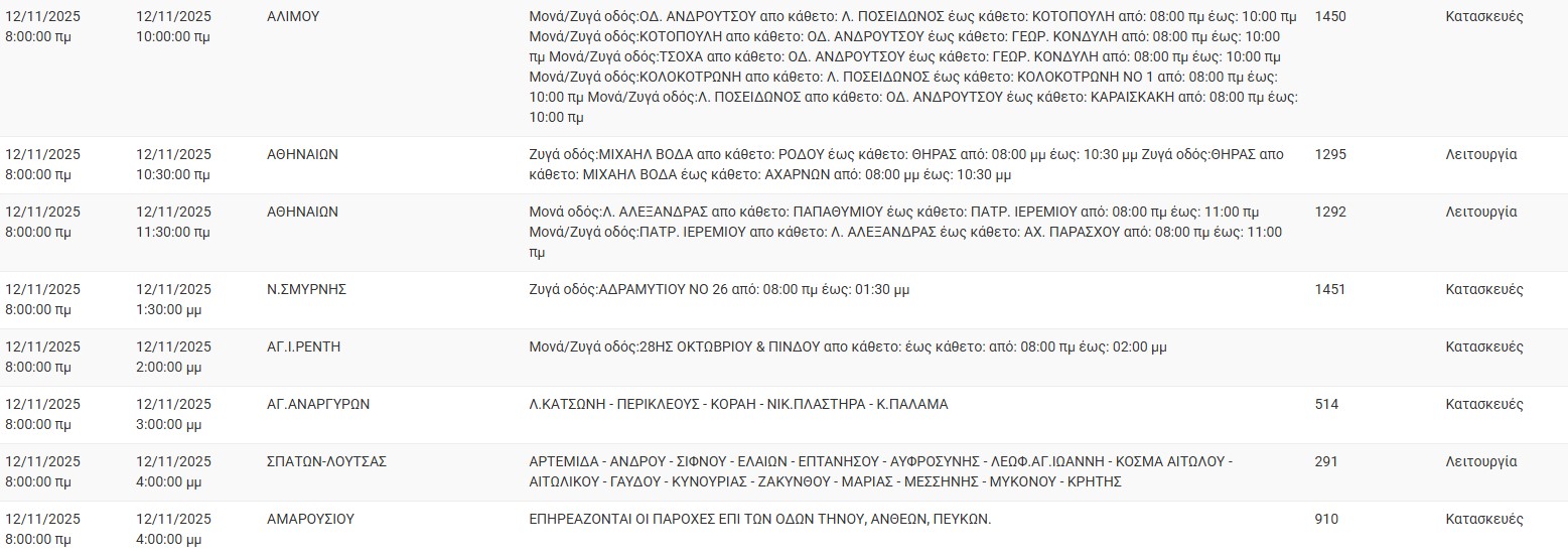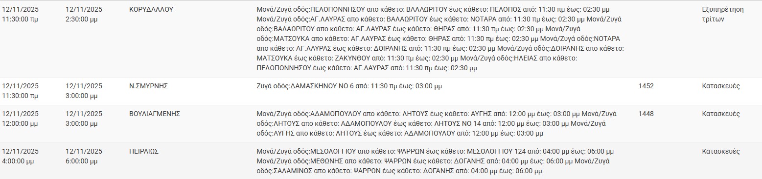 Διακοπές ρεύματος σήμερα (12/11) στην Αθήνα και σε άλλες 14 περιοχές της Αττικής