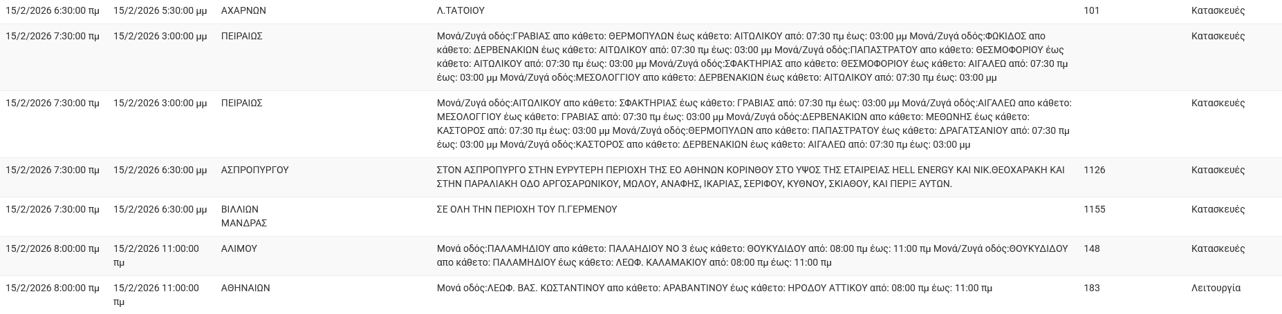 Διακοπές ρεύματος έχει προγραμματίσει για σήμερα, Κυριακή 15 Φεβρουαρίου 2026,  ο ΔΕΔΔΗΕ σε διάφορες περιοχές της Αττικής.