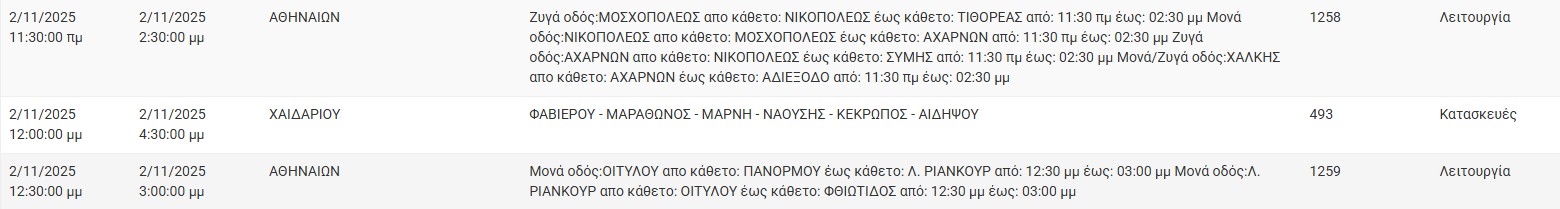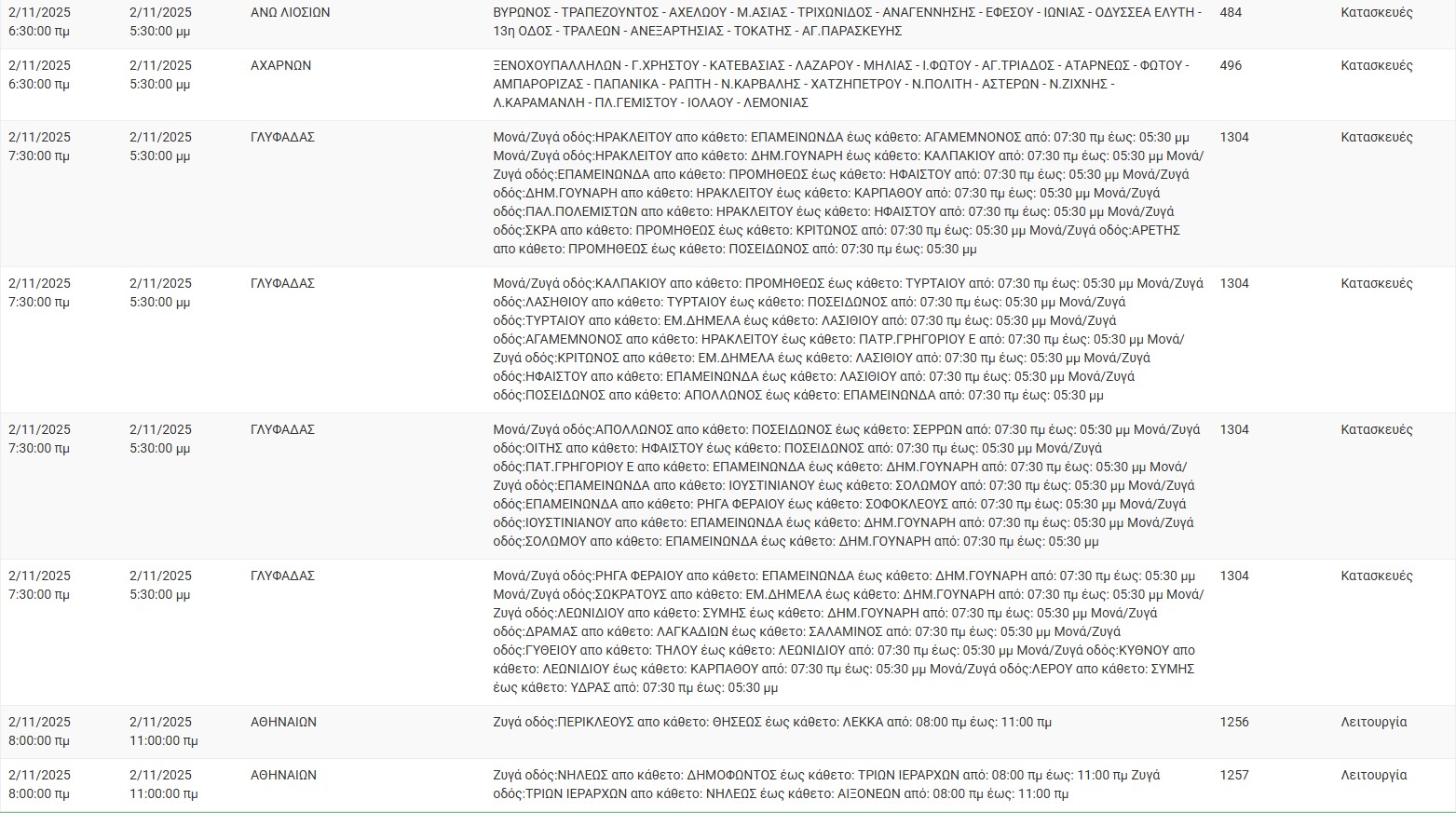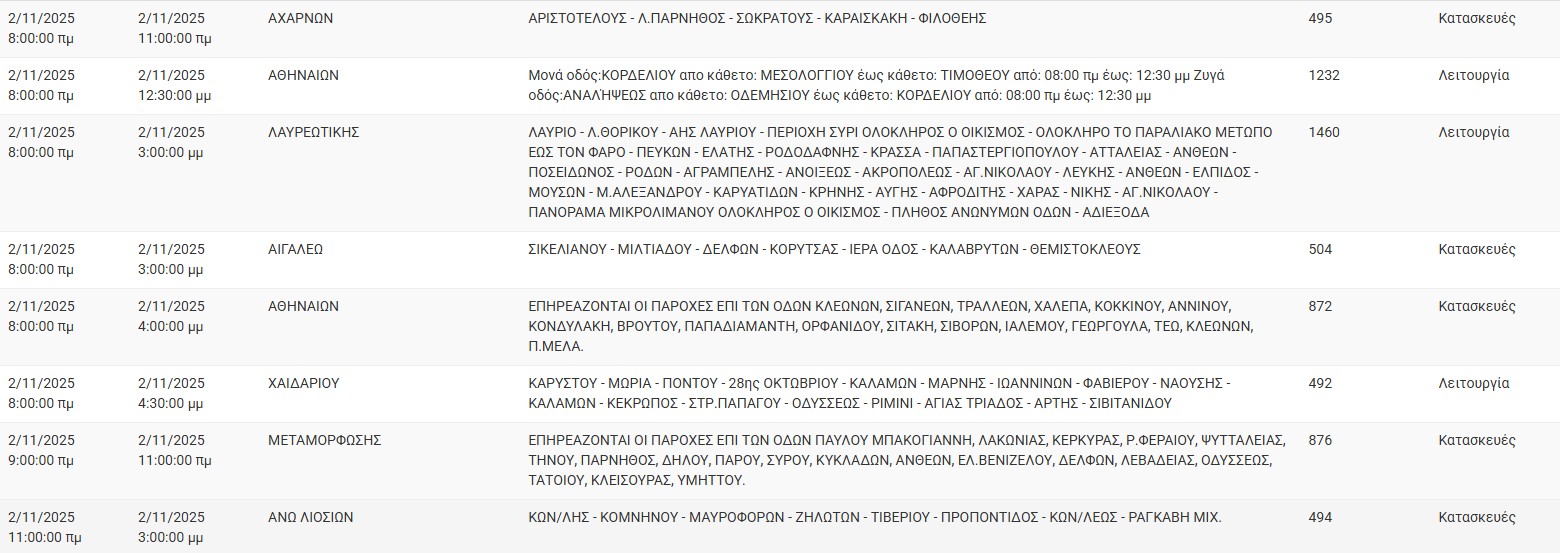 Διακοπές ρεύματος σήμερα (2/11) στην Αθήνα και σε άλλες 7 περιοχές της Αττικής