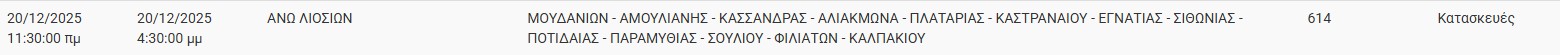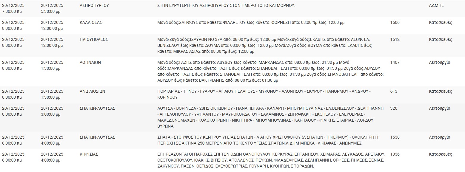 Διακοπές ρεύματος έχει προγραμματίσει για σήμερα, Σάββατο 20 Δεκεμβρίου 2025, ο ΔΕΔΔΗΕ σε διάφορες περιοχές της Αττικής.