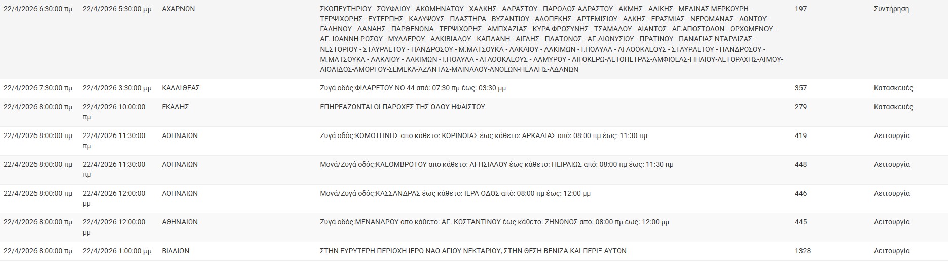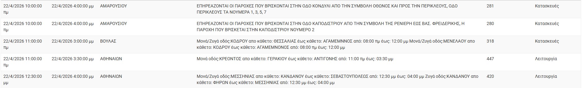 Διακοπές ρεύματος σήμερα (22/4) στην Αθήνα και σε άλλες 11 περιοχές της Αττικής