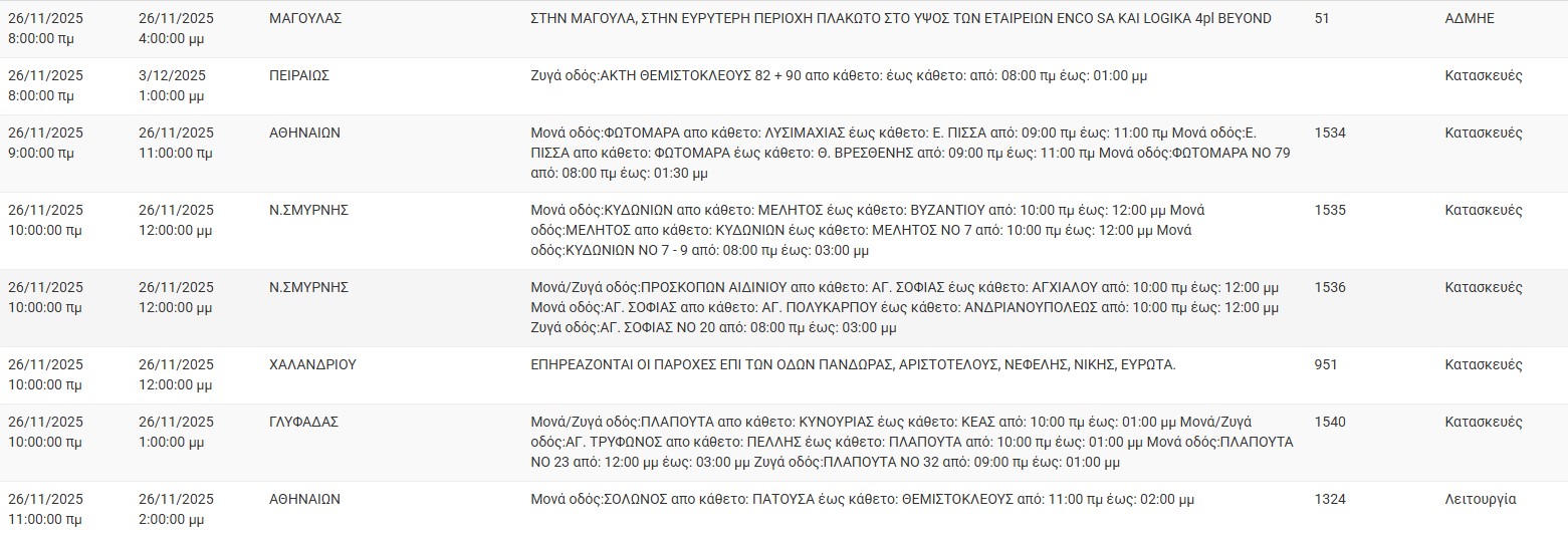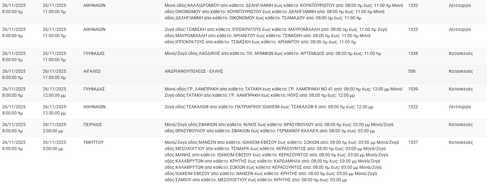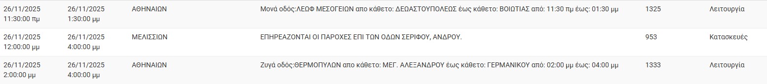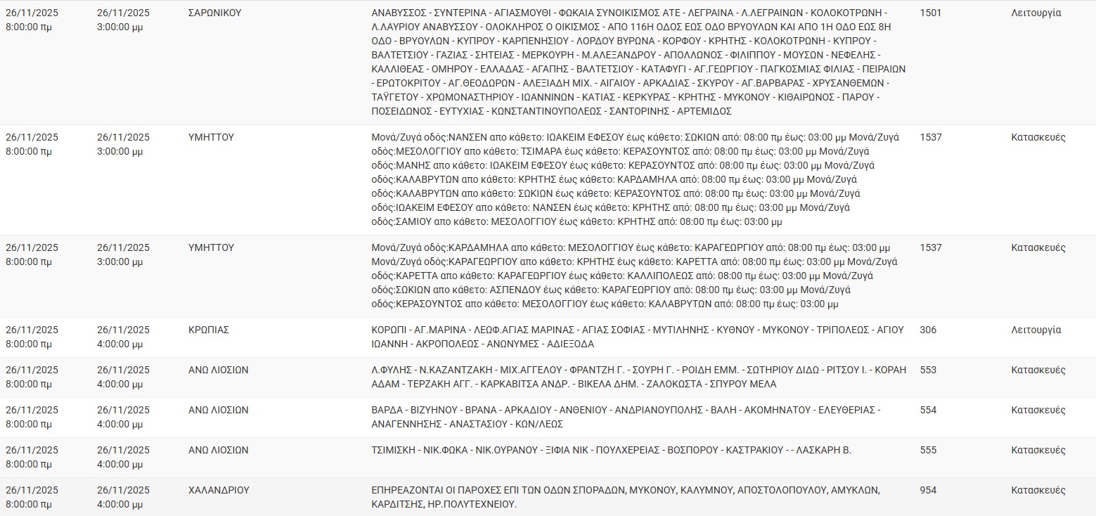 Διακοπές ρεύματος σήμερα (26/11) στην Αθήνα και σε άλλες 11 περιοχές της Αττικής