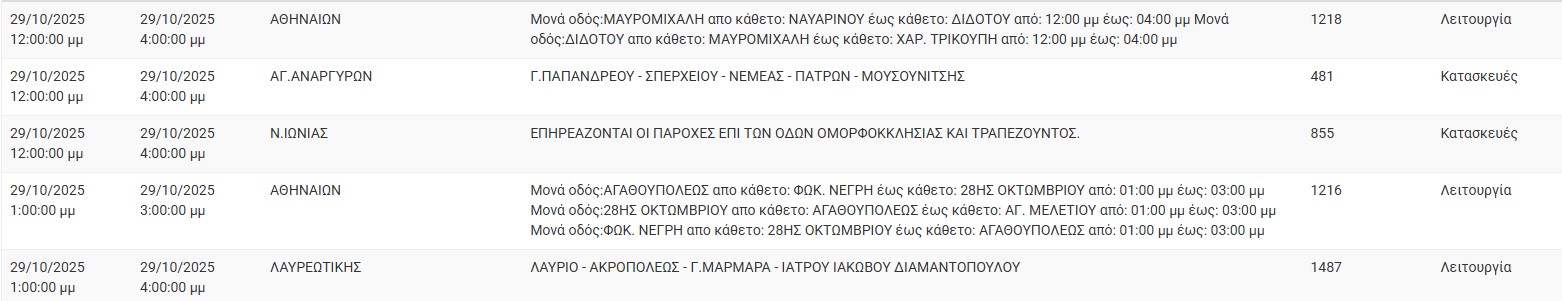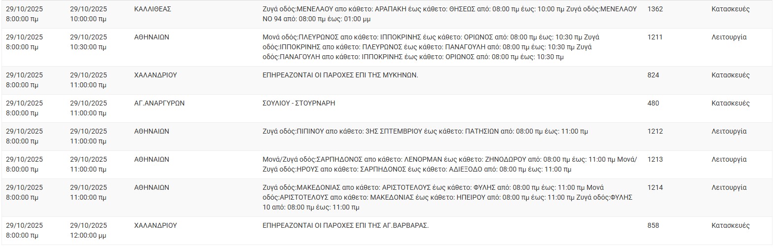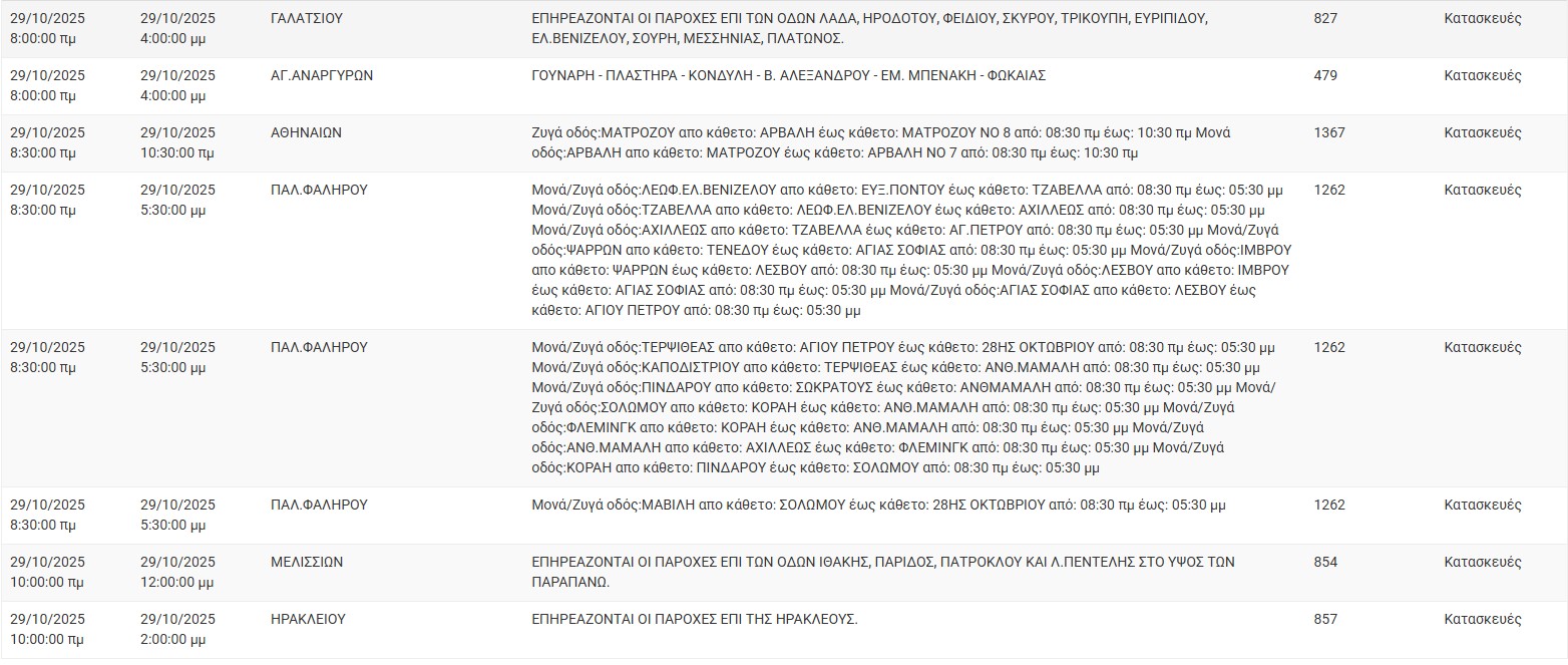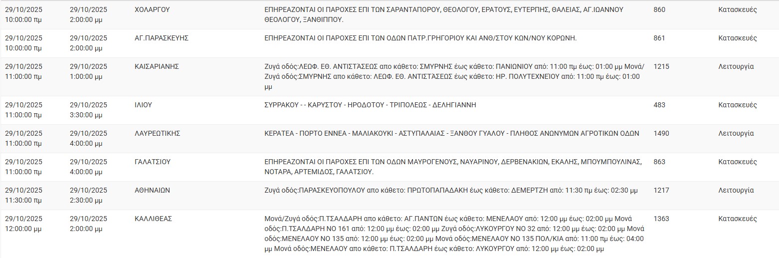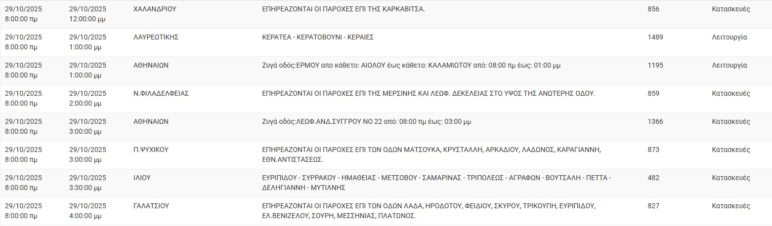 Διακοπές ρεύματος σήμερα (29/10) στην Αθήνα και σε άλλες 15 περιοχές της Αττικής
