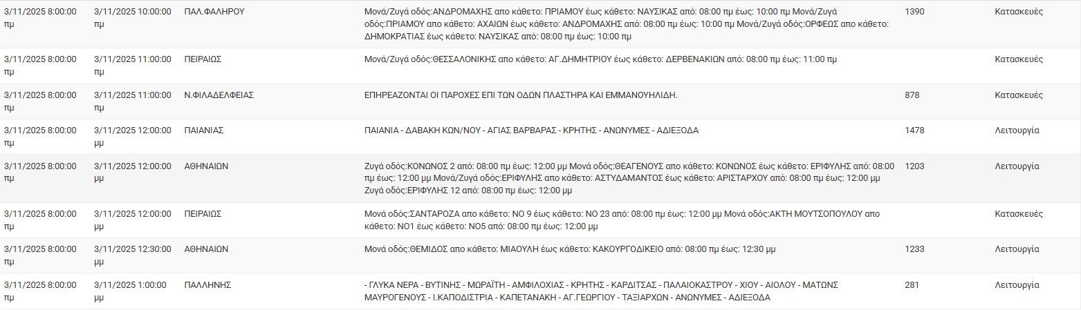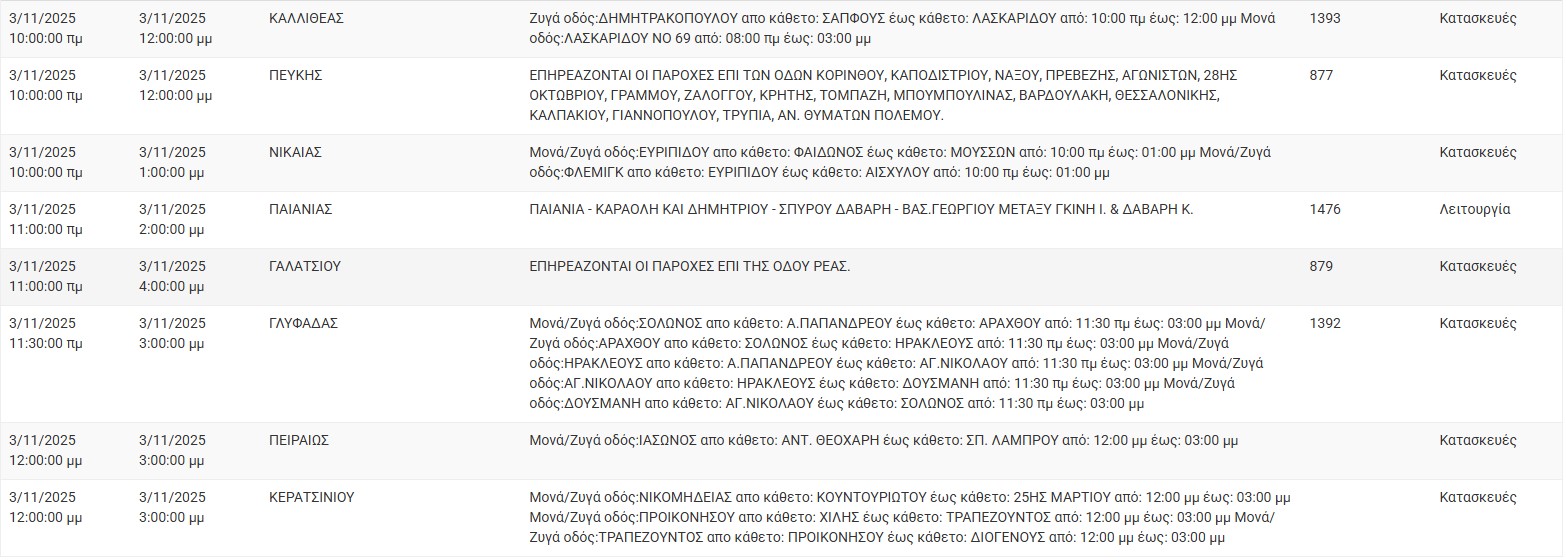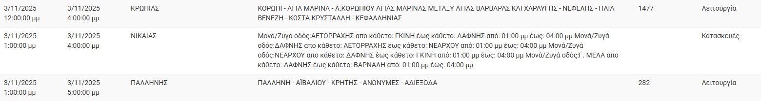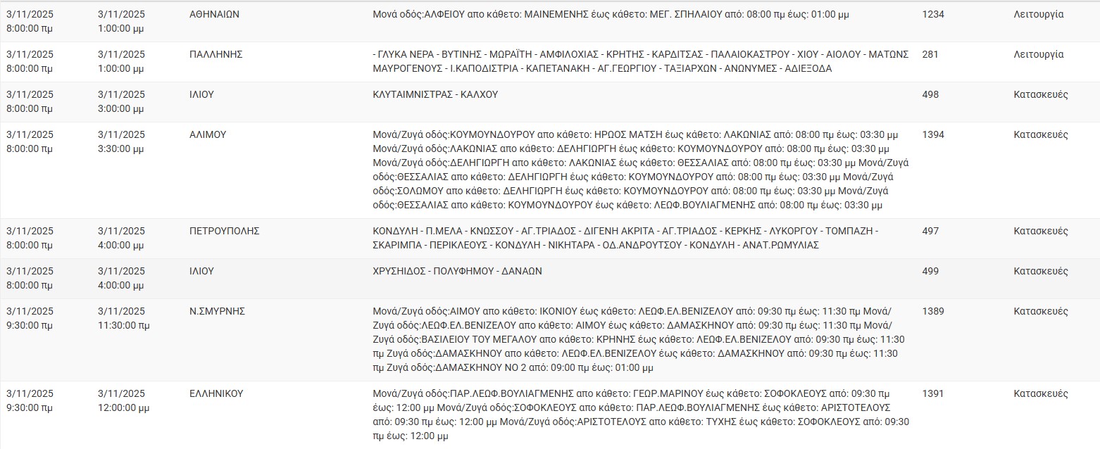 Διακοπές ρεύματος σήμερα (3/11) στην Αθήνα και σε άλλες 17 περιοχές της Αττικής
