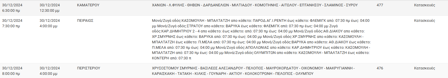 Διακοπές ρεύματος σήμερα (30/12) σε 3 περιοχές της Αττικής
