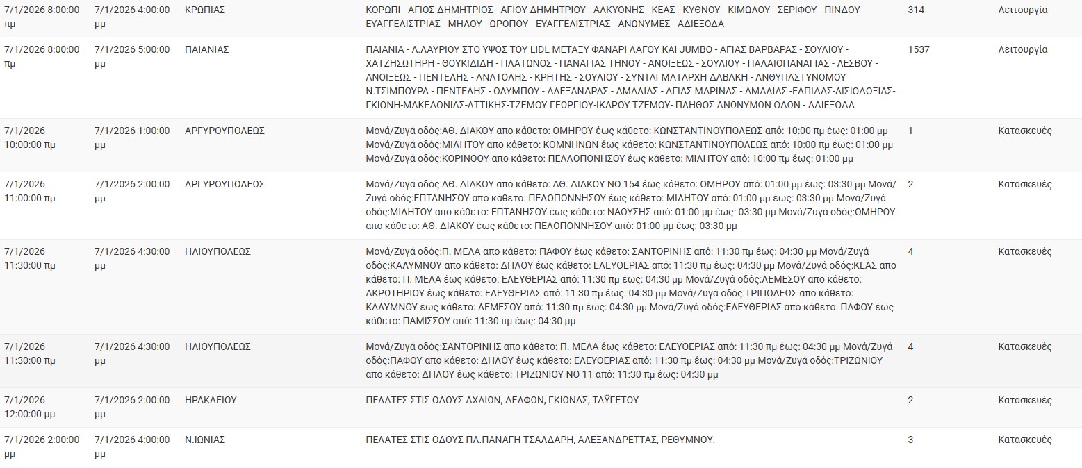 Διακοπές ρεύματος σήμερα (7/1) στην Αθήνα και σε άλλες 10 περιοχές της Αττικής