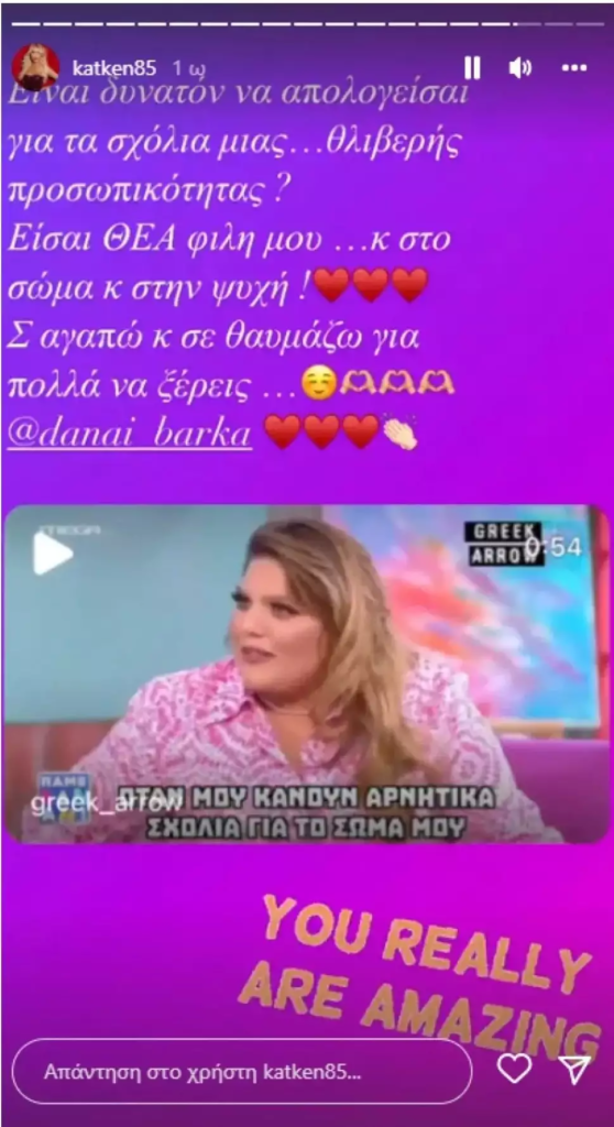 Η Κατερίνα Καινούργιου είχε κοινοποιήσει το βίντεο με την απάντηση που είχε δώσει η Δανάη Μπάρκα και της είχε γράψει: «Είναι δυνατόν να απολογείσαι για τα σχόλια μιας… θλιβερής προσωπικότητας; Είσαι θεά φίλη μου… και στο σώμα και στην ψυχή! Σ’ αγαπώ και σε θαυμάζω για πολλά να ξέρεις».