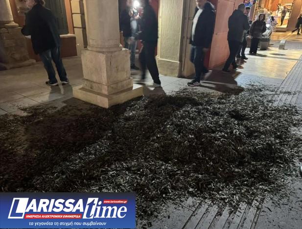 Φύλλα από ελιές πέταξαν έξω από την Περιφέρεια Κρήτης, αγροτοκτηνοτρόφοι, που πραγματοποίησαν νωρίτερα απόψε διαμαρτυρία στο Ηράκλειο.